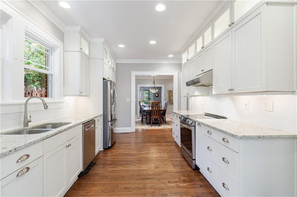 Step inside to a light-filled interior where new windows frame leafy neighborhood views and natural light pours into every room. The modern kitchen, outfitted with stainless steel appliances, stone counters, and updated cabinetry, is as functional as it is stylish, ready for casual weeknight meals or hosting friends before a night out. A separate dining room makes entertaining a joy, while the den offers flexibility for a home office, media room, or cozy library.