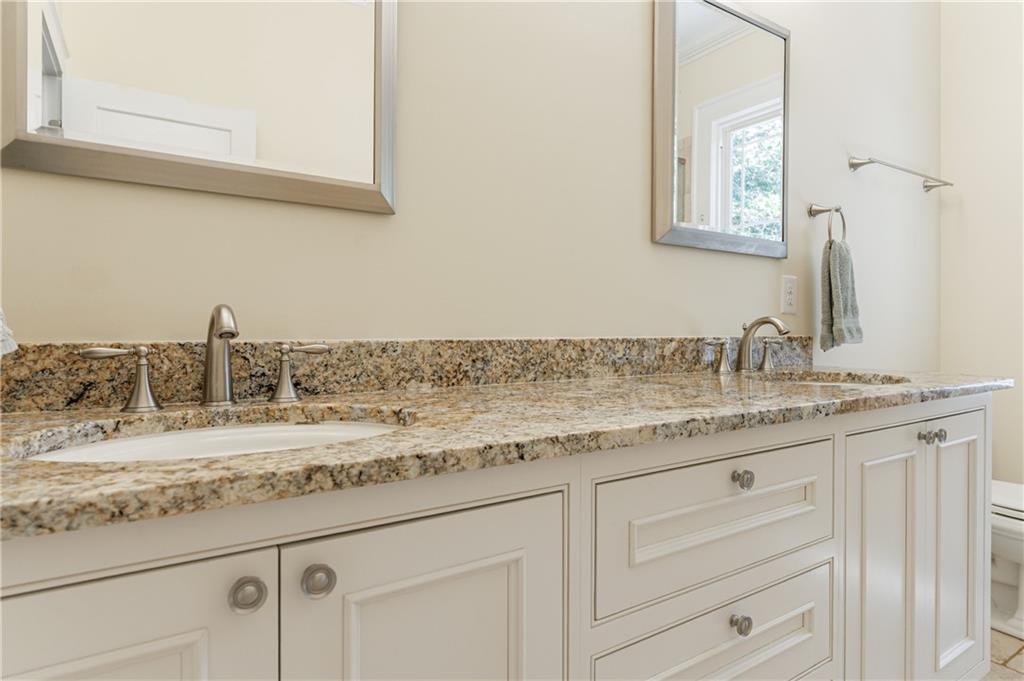 The primary suite feels like a private retreat with a spa-inspired bathroom featuring dual vanities, stone counters, a large walk-in shower, and a custom walk-in closet. The secondary bedroom and updated hall bath ensure space and comfort for family or guests.