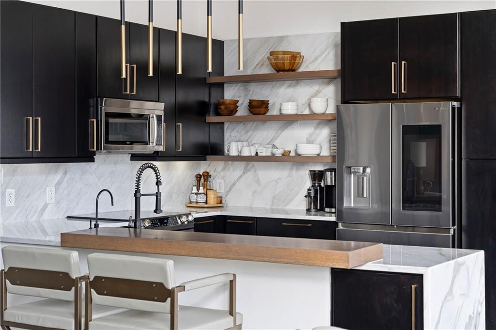 The open-concept living and dining areas are perfect for both entertaining and everyday living, anchored by a stunning kitchen that boasts a Venato marble waterfall countertop, sleek cabinetry, custom marble walls, and high-end stainless steel appliances. The expansive private terrace further enhances the living experience, allowing for seamless indoor-outdoor entertaining.