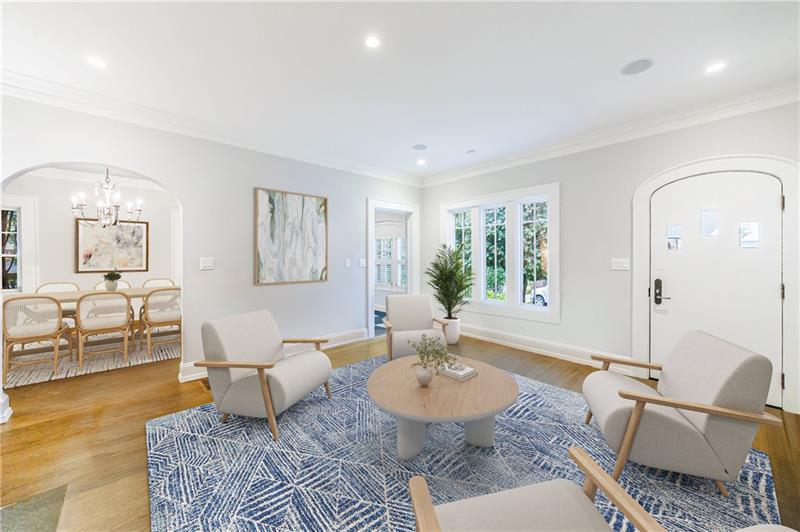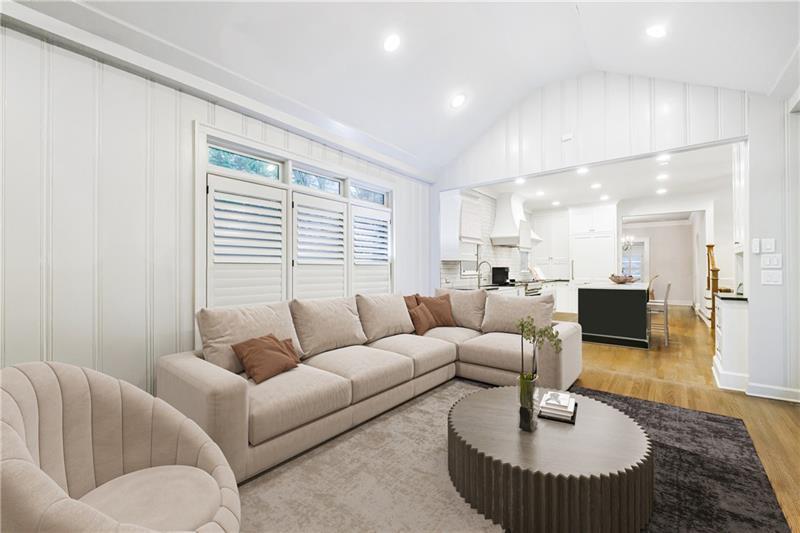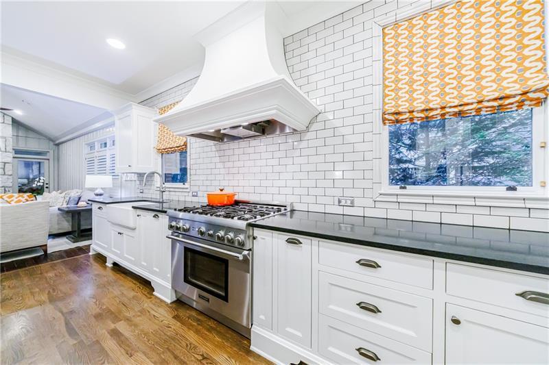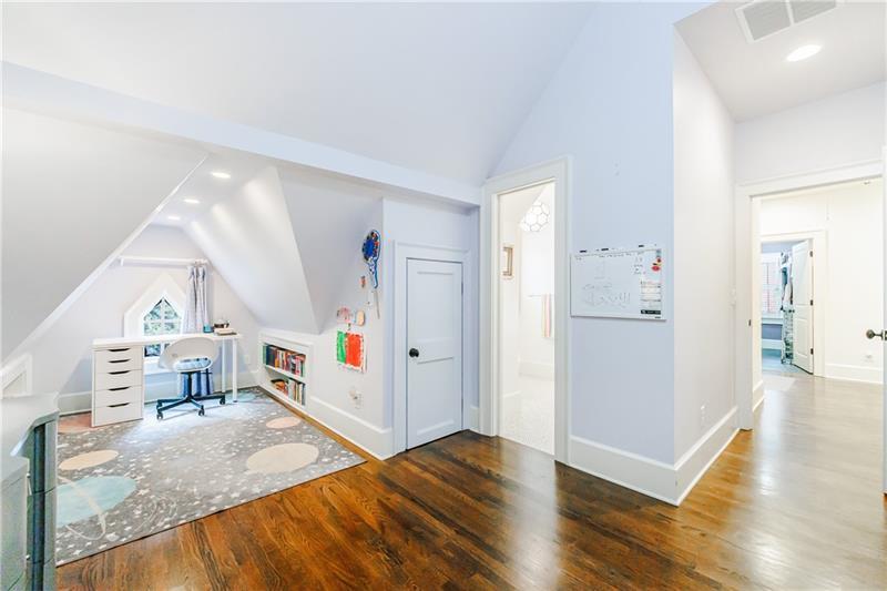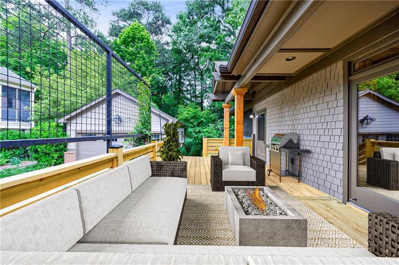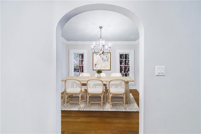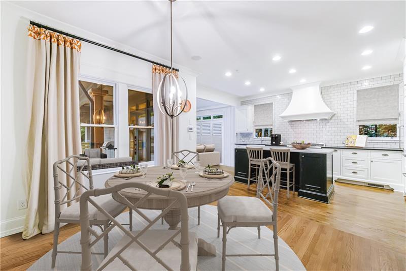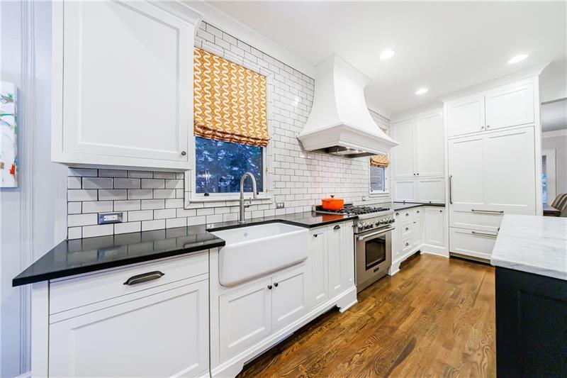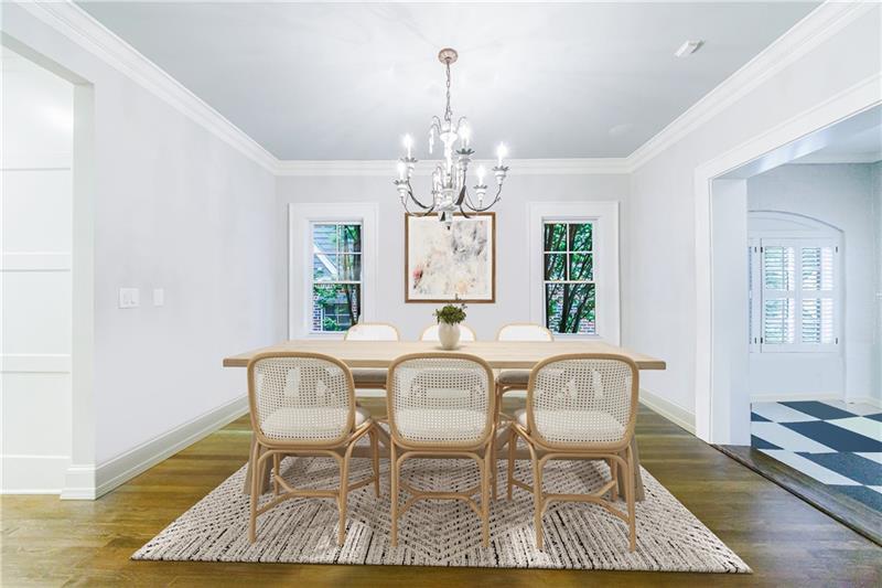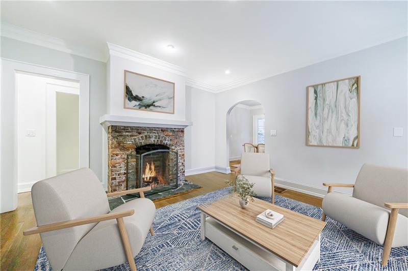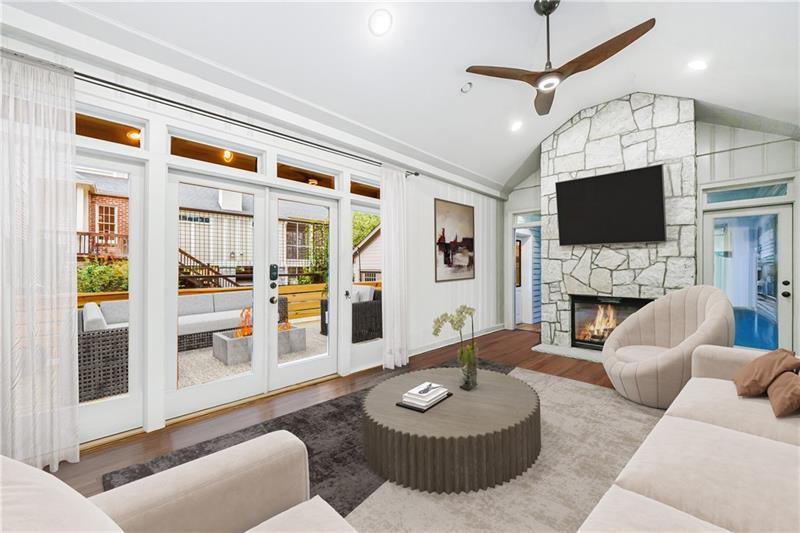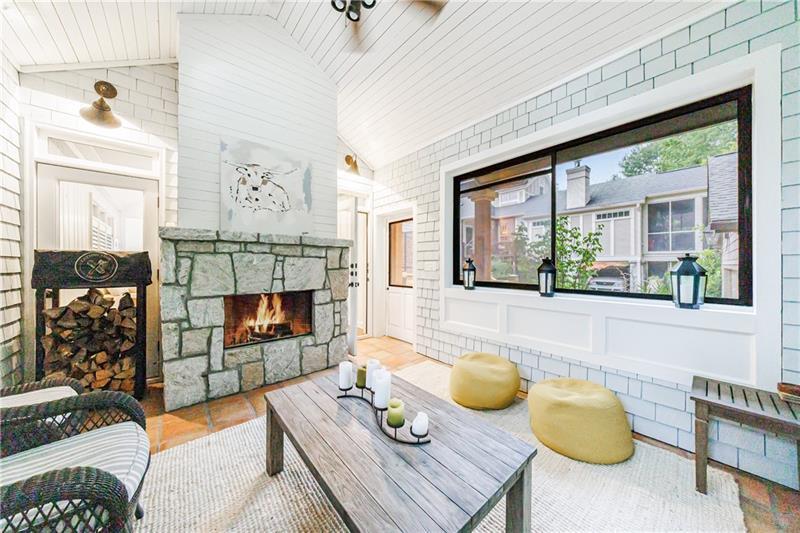 Discover an extraordinary opportunity on one of Morningside's most sought-after streets, nestled in the heart of this vibrant neighborhood! This stunning Tudor-style home, masterfully renovated by John Willis Homes, blends modern elegance with timeless character. Enter through the arched front door into a welcoming living room with a brick fireplace, gleaming hardwood floors, and soaring ceilings, flowing seamlessly into a sophisticated dining room via an elegant arched doorway. Ideal for hosting, the dining room connects to a sunlit sunroom and a pristine white kitchen featuring stone countertops, a farm-style sink, a stainless steel Thermador gas range, a SubZero Refrigerator, and a spacious island. The open-concept kitchen and breakfast area lead to a cozy family room with a vaulted ceiling, floor-to-ceiling stone fireplace, and large windows and doors opening to a generous exterior deck. The adjacent sunroom, with its own fireplace and treetop views, offers a tranquil escape. The expansive primary suite boasts a spa-like bathroom with an oversized shower, clawfoot tub, dual-sink marble vanity, and a custom-designed closet. Two additional main-level bedrooms with beautifully appointed bathrooms provide ample space, while an upstairs loft, bedroom, and full bath create a flexible space perfect for an office, playroom, or gym. Outdoors, enjoy dining on the large deck, which leads to a fenced backyard with a grassy courtyard ideal for recreation. A detached two-car garage and driveway parking add convenience, just seconds from charming shops, restaurants, and parks along tree-lined sidewalks. Modern upgrades include a level 2 car charger, Tesla Wall Connector, and a whole-house generator for added peace of mind.