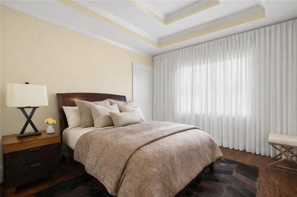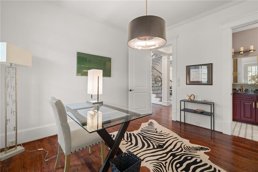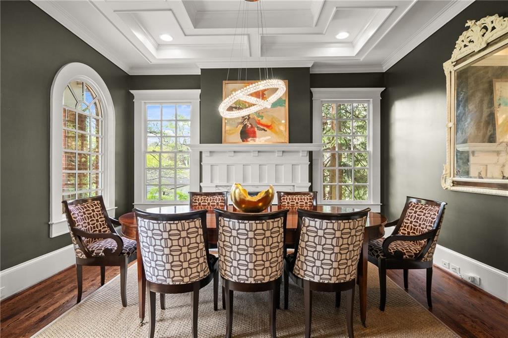 A sophisticated dining room with its own fireplace and coffered ceiling offers an elegant setting for dinners and gatherings. The main level also features an additional living room, a private guest suite or office with a full bath, and a powder room tucked just around the corner from the kitchen.