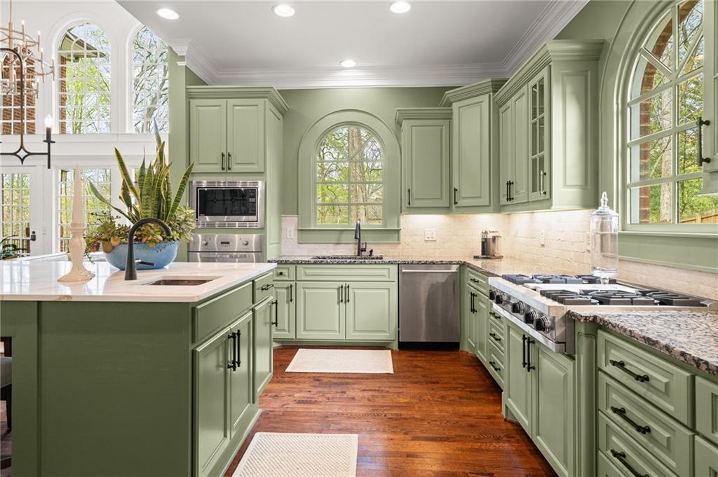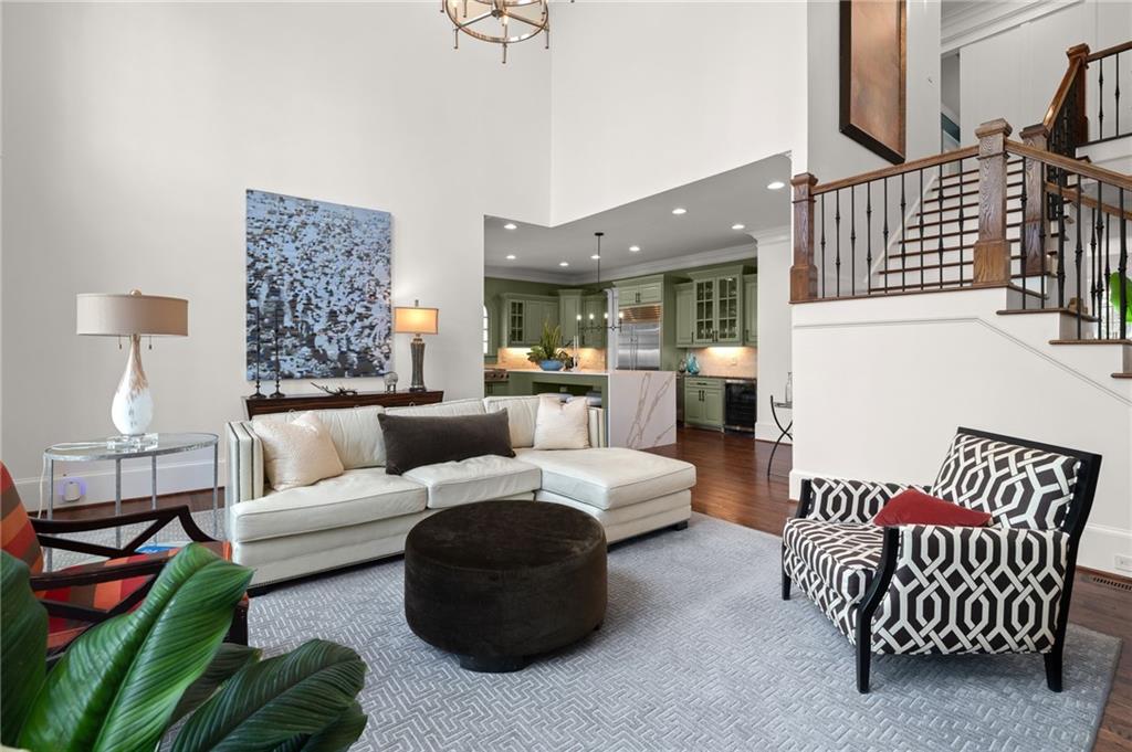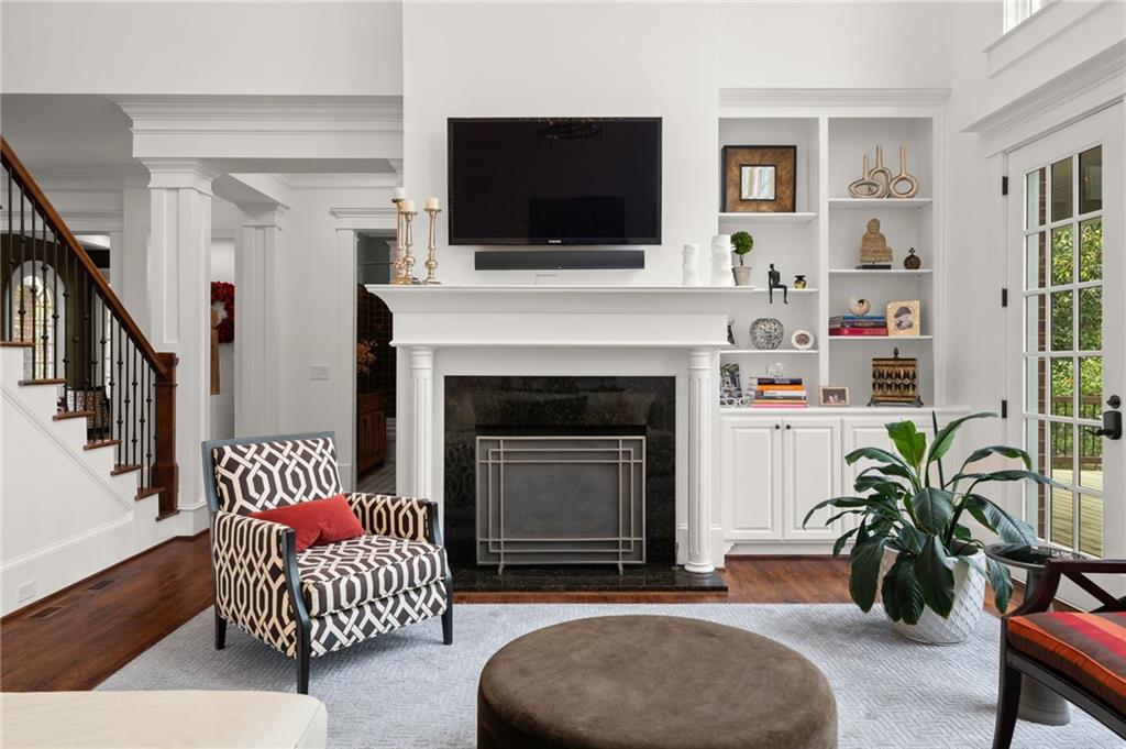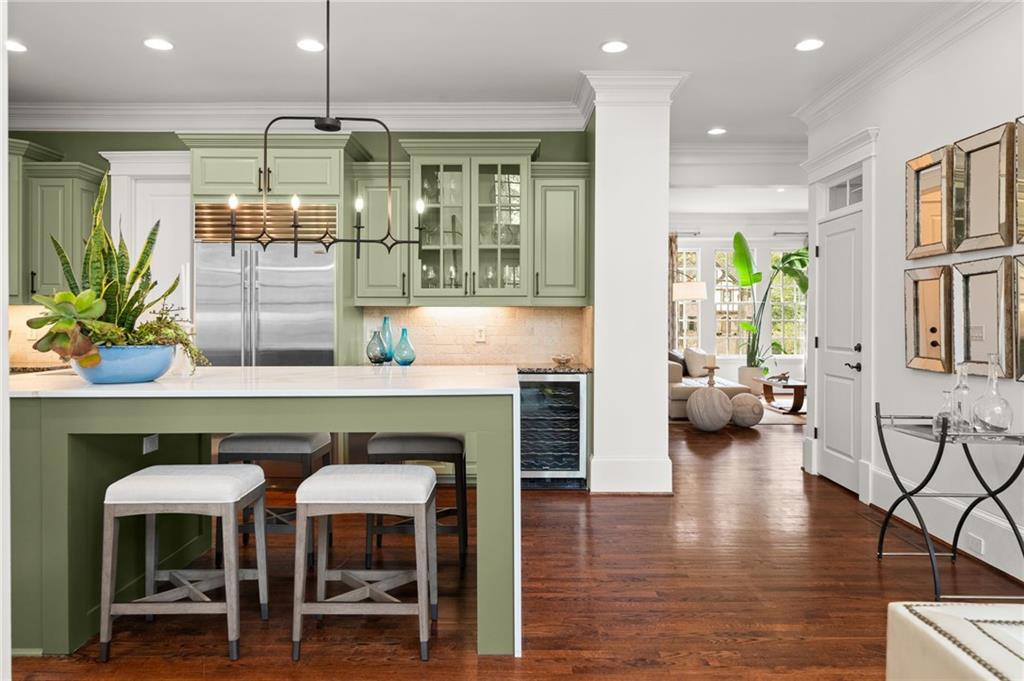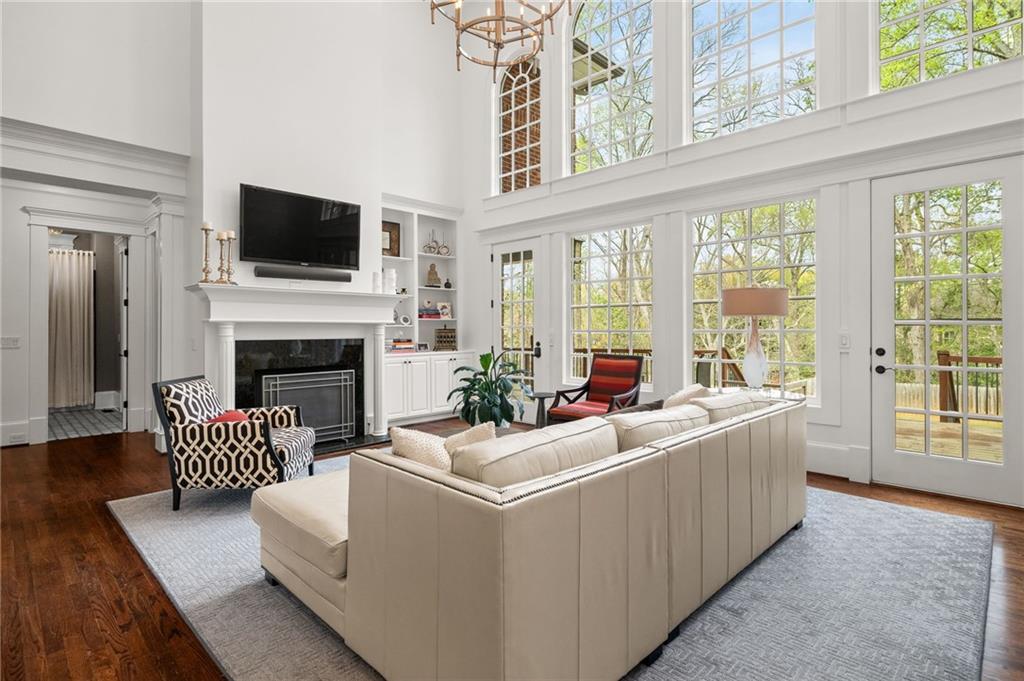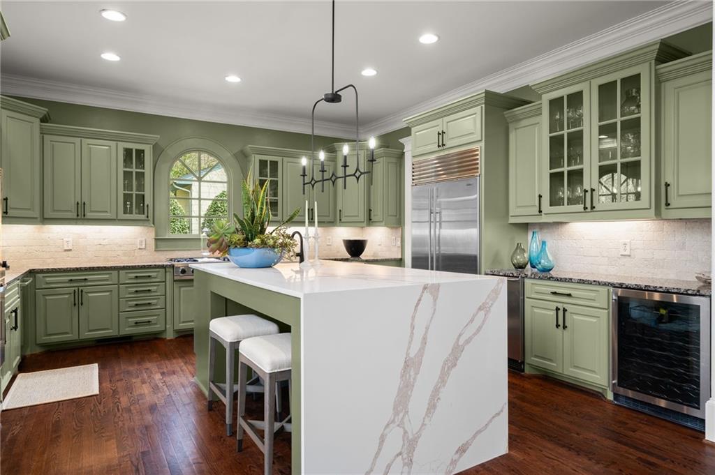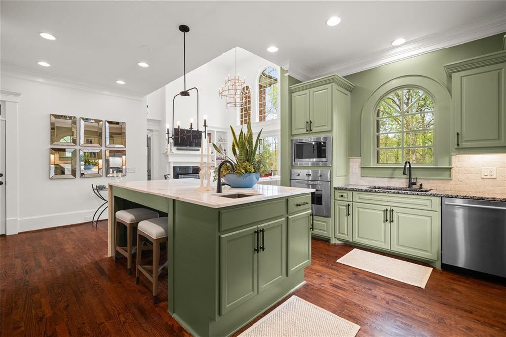 The dramatic two-story great room is anchored by a striking wall of Palladian windows, a lovely fireplace, and custom built-ins, seamlessly flowing into the chef's kitchen and making it the heart of the home. The kitchen is both functional and showstopping, highlighted by an oversized waterfall-edge quartz island with seating, premium stainless steel appliances, including a Sub-Zero refrigerator and beverage fridge, a gas cooktop, and a prep sink, and is perfectly designed for both casual living and elevated entertaining.