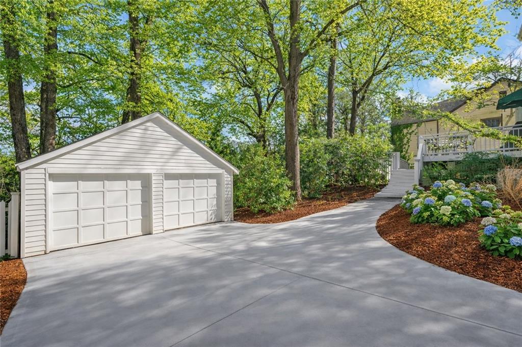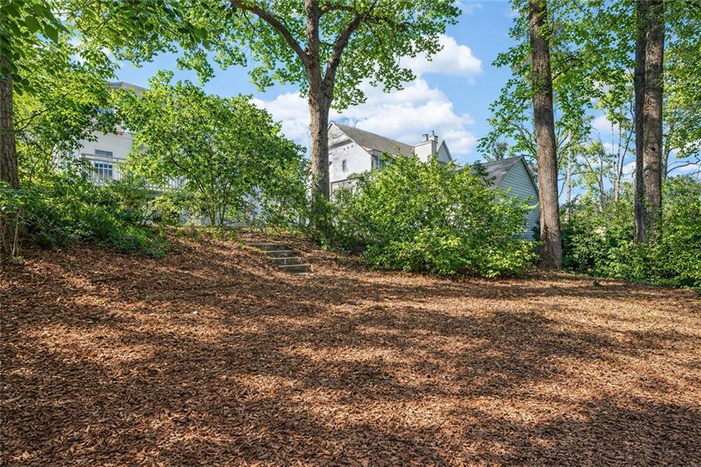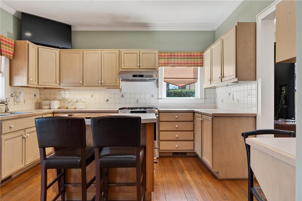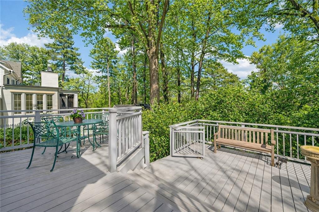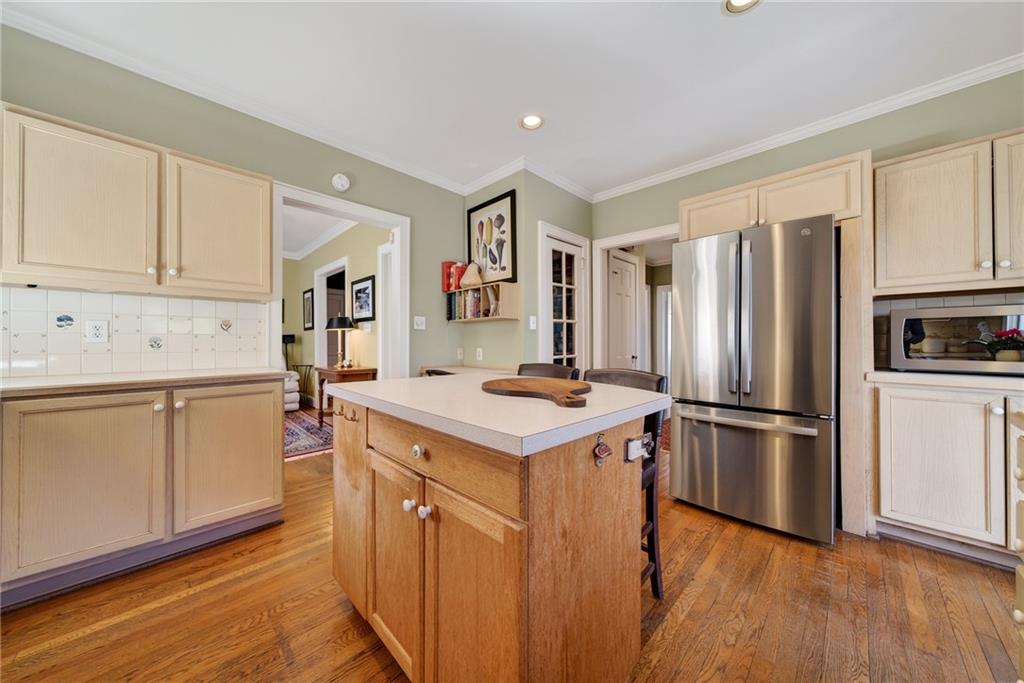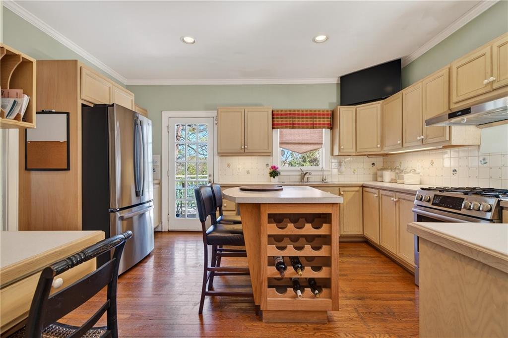 The kitchen offers generous cabinetry, stainless steel appliances, a center island with seating and wine storage, and easy access to the back deck, creating effortless indoor-outdoor living. Venture outside to enjoy a private backyard retreat, ideal for entertaining, gardening, or quiet evenings under the trees.