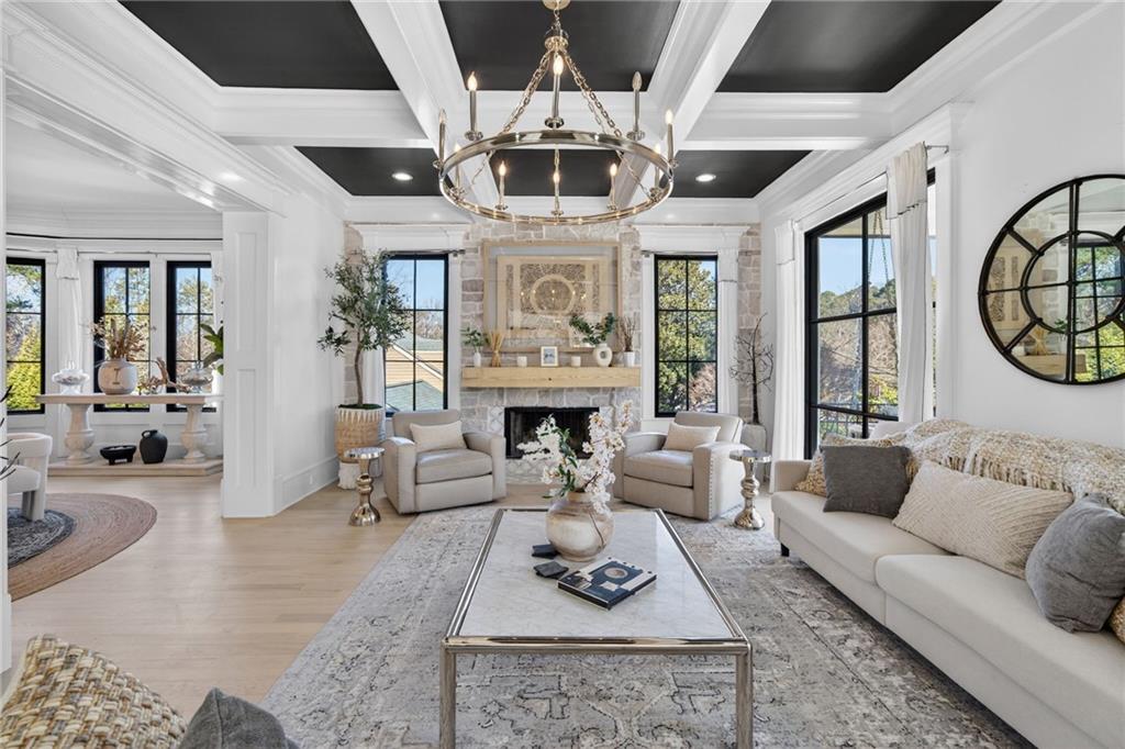 The formal living room features a coffered ceiling, fireplace, and dual French doors, flowing effortlessly into a banquet-sized dining room, perfect for entertaining. A butler's pantry leads to the stunning white chef's kitchen, highlighted by an oversized stone island with seating and a farmhouse sink, along with top-of-the-line stainless steel appliances including Dacor, Sub-Zero, and Viking. Additional features include a built-in desk, large pantry, and open views into the inviting family room with a fireplace, custom built-ins, and another set of French doors leading outdoors.