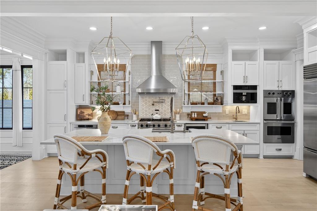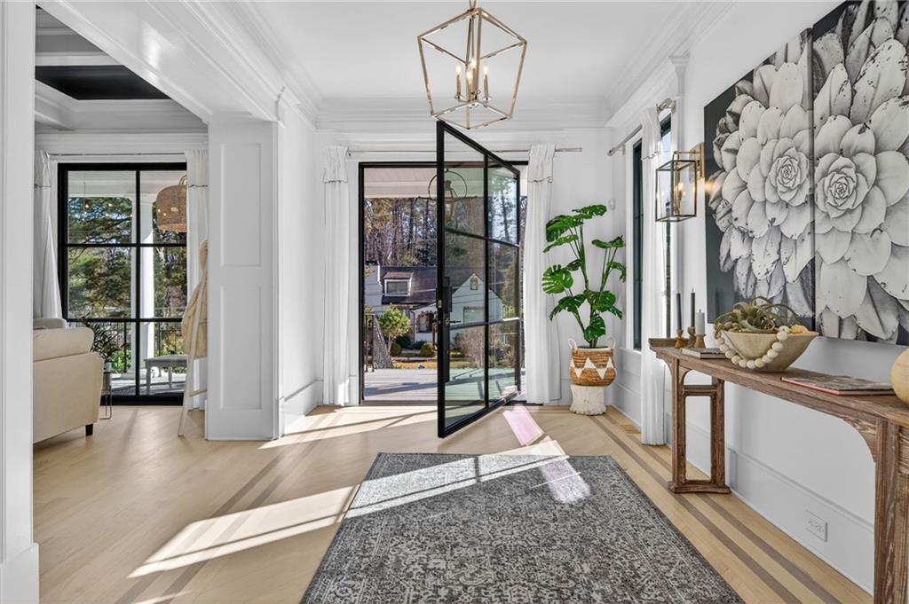 A large covered front porch welcomes you with ample space for outdoor seating and a classic porch swing. Inside, an elegant foyer showcases detailed moldings, soaring ceilings, pristine hardwood floors, and a seamless open-concept layout.