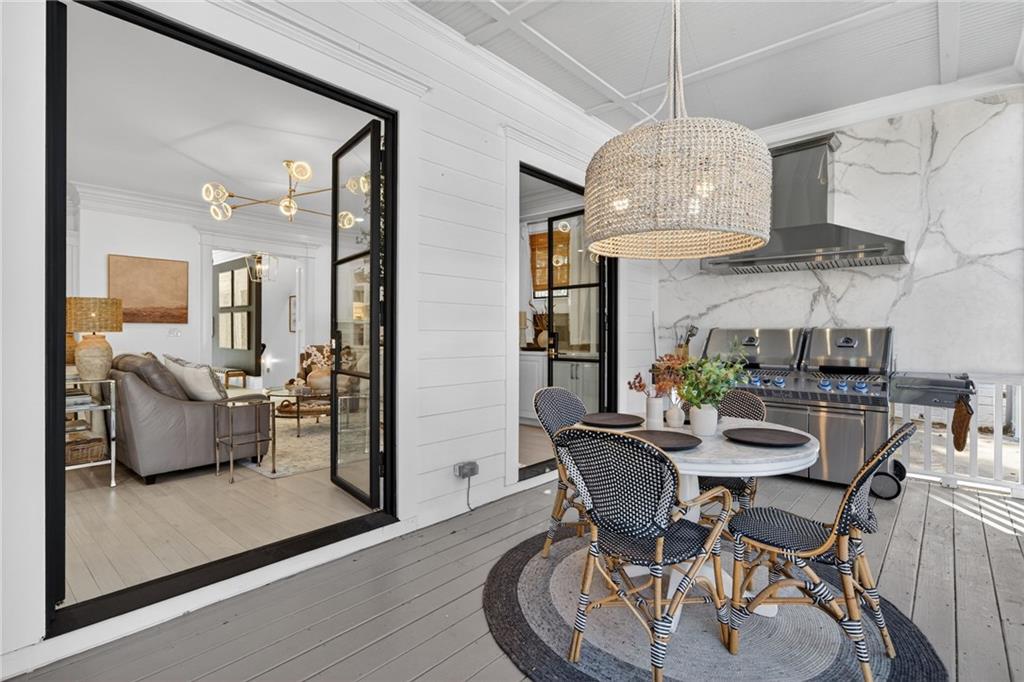 A bright breakfast room with wall-to-wall windows overlooks the private backyard. Just off the family room, a covered outdoor living space with privacy curtains provides the perfect setting for year-round enjoyment.