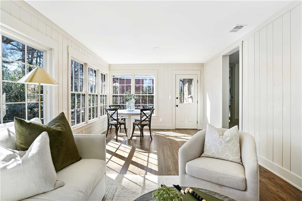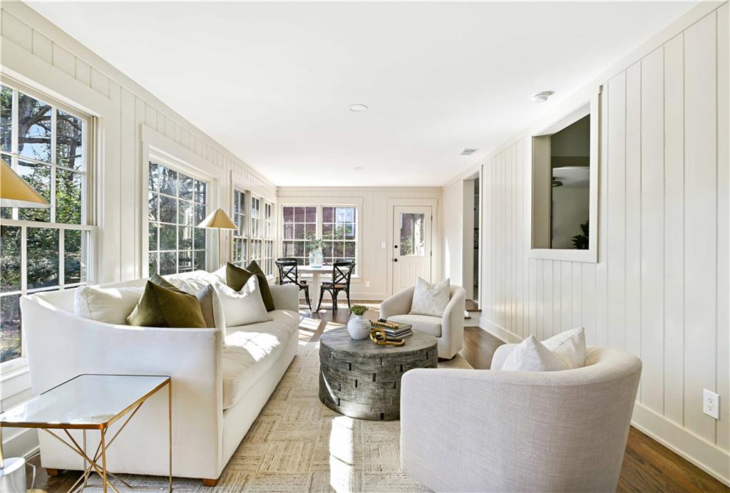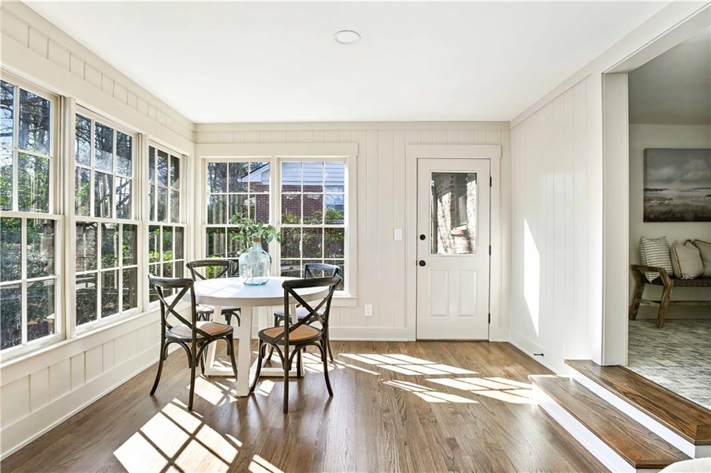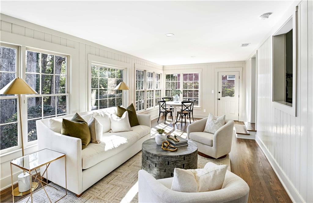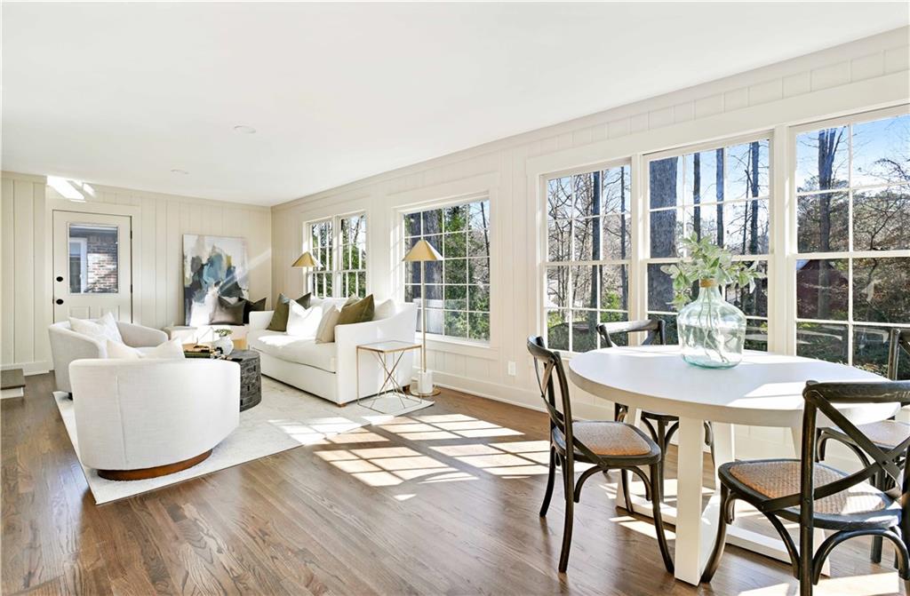 Just beyond, the sunroom-style family room is wrapped in windows on three sides, flooding the space with natural light and offering tranquil views of the backyard. With direct outdoor access, it's an ideal spot for morning coffee, casual evenings, or hosting friends as the day winds down.