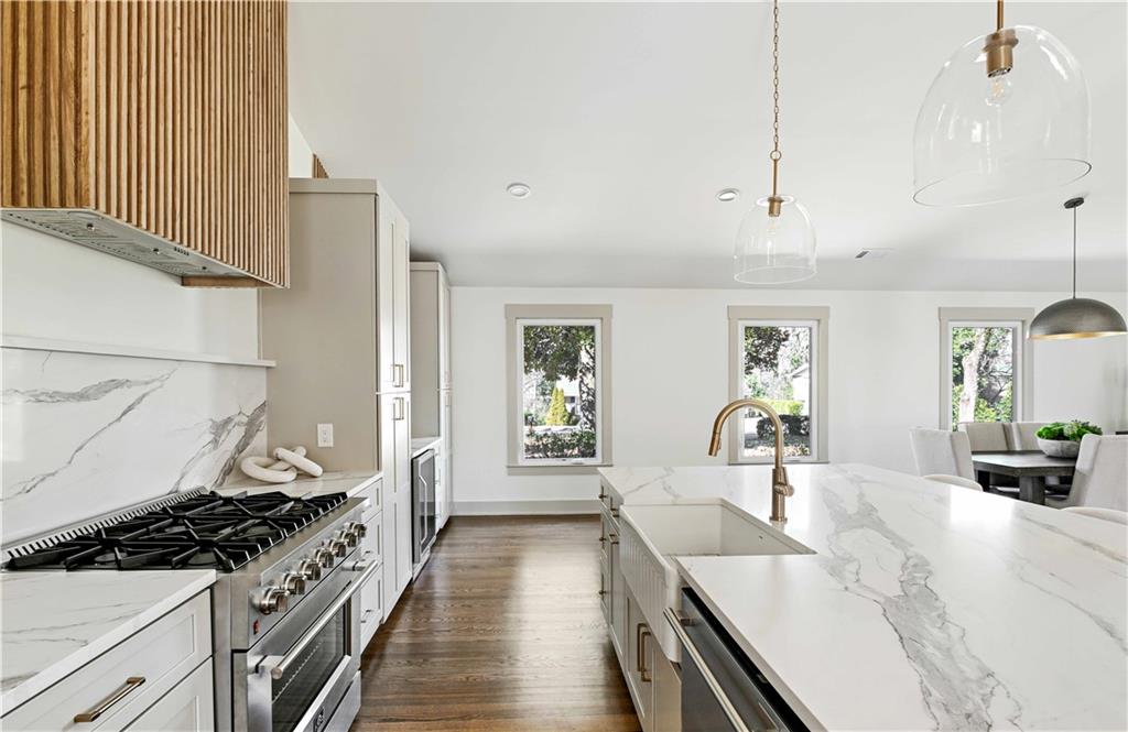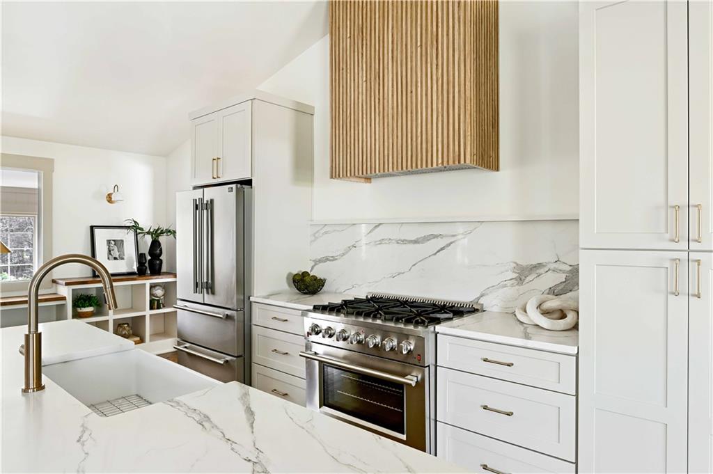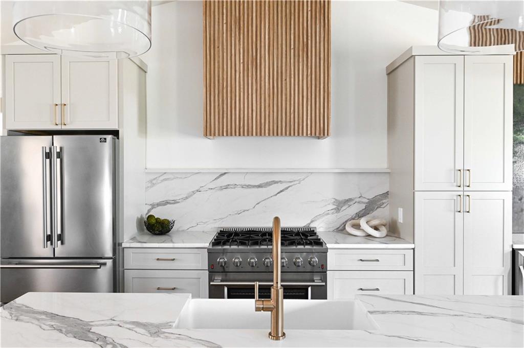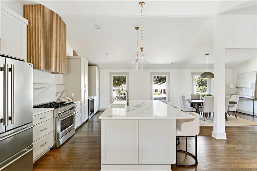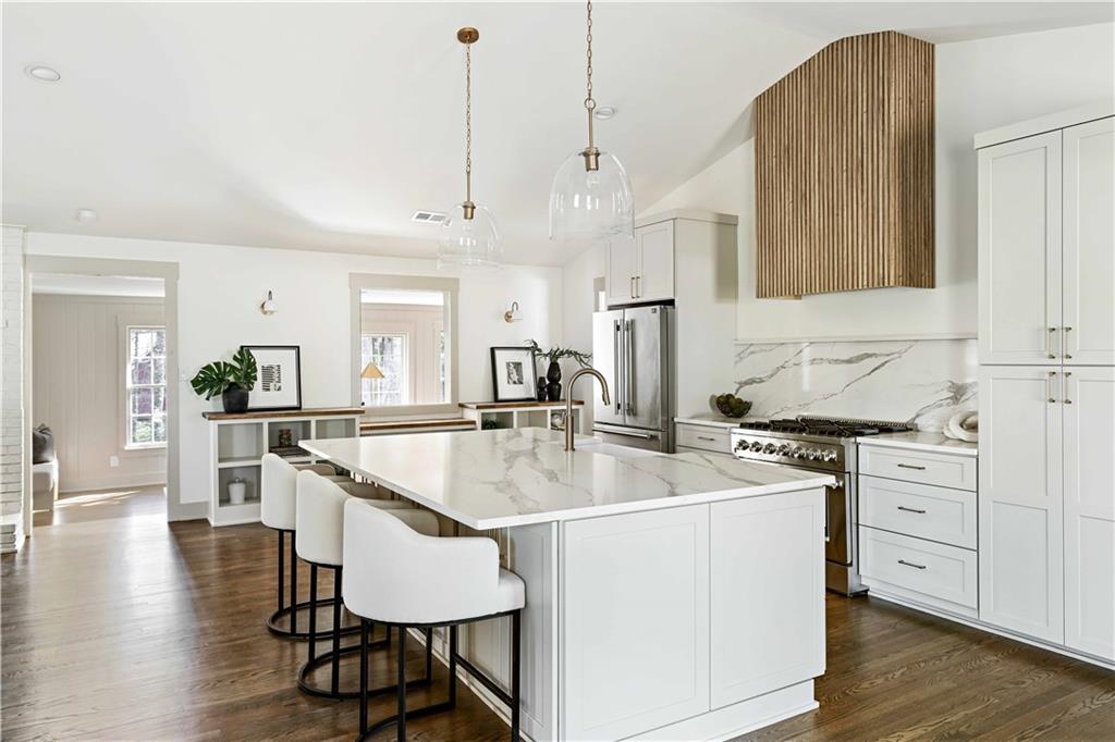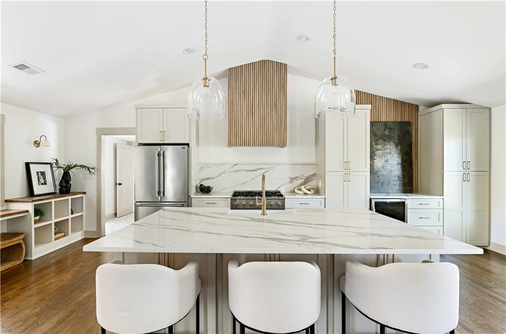 The kitchen is designed for living, featuring sleek stainless steel appliances, custom cabinetry, and an oversized quartz-topped island with generous seating--perfect for everything from weeknight meals to weekend gatherings. Pendant lighting and clean lines elevate the space while keeping it warm and welcoming.