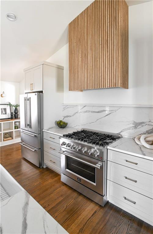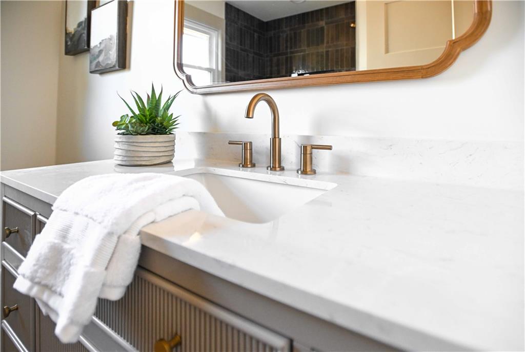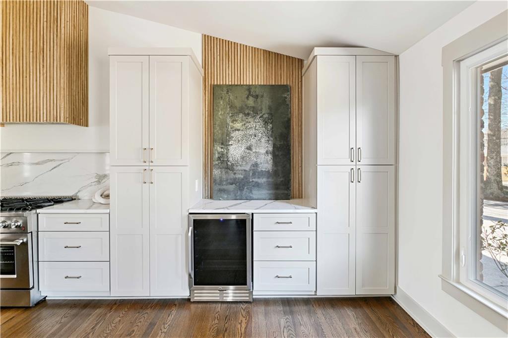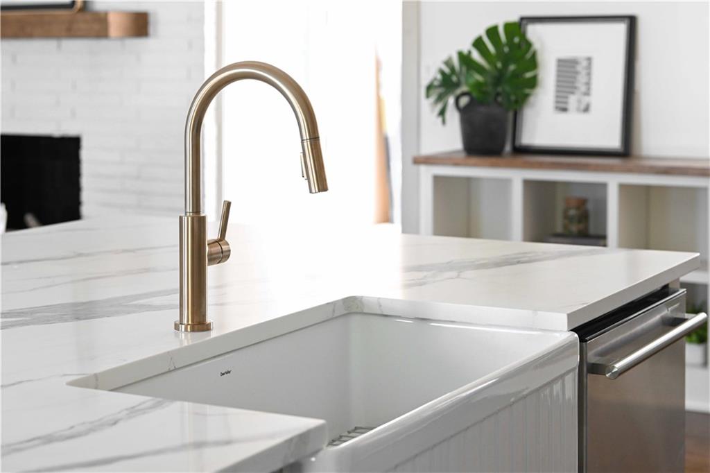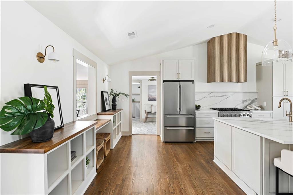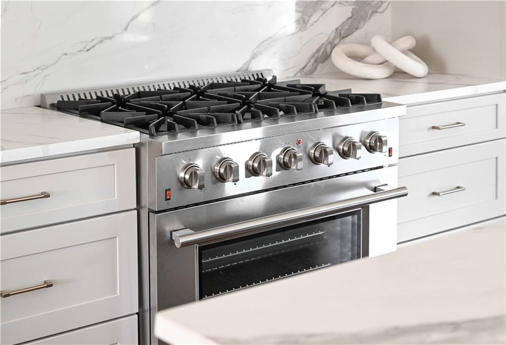 The kitchen is designed for living, featuring sleek stainless steel appliances, custom cabinetry, and an oversized quartz-topped island with generous seating--perfect for everything from weeknight meals to weekend gatherings. Pendant lighting and clean lines elevate the space while keeping it warm and welcoming.