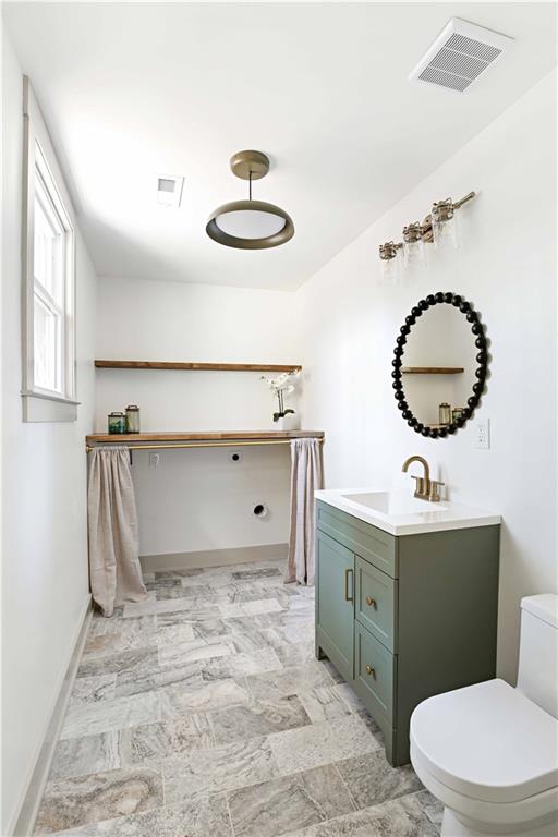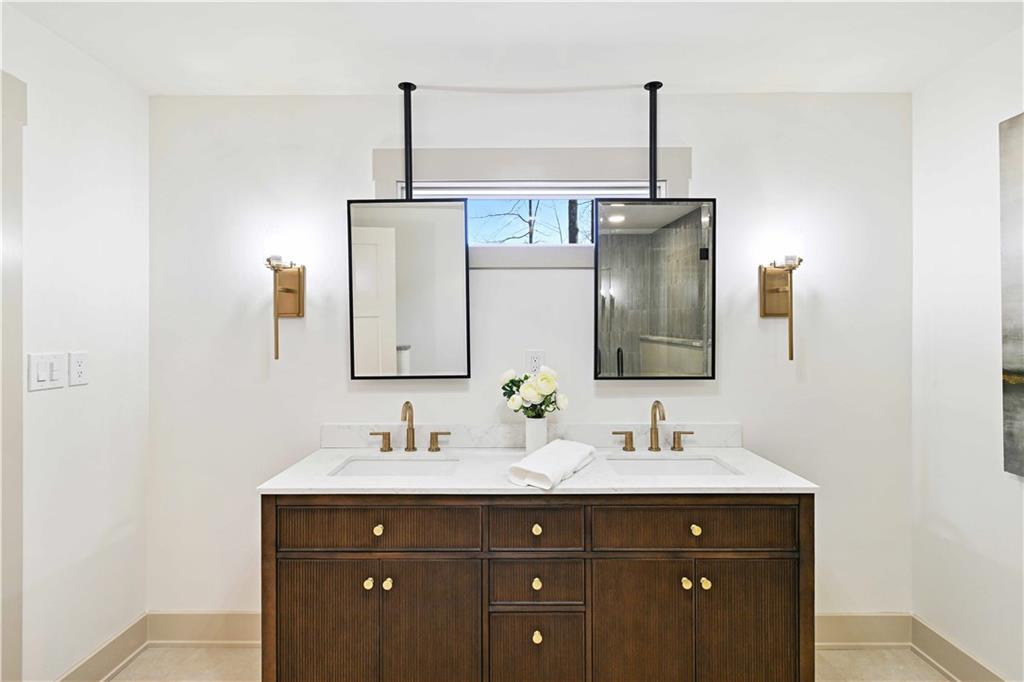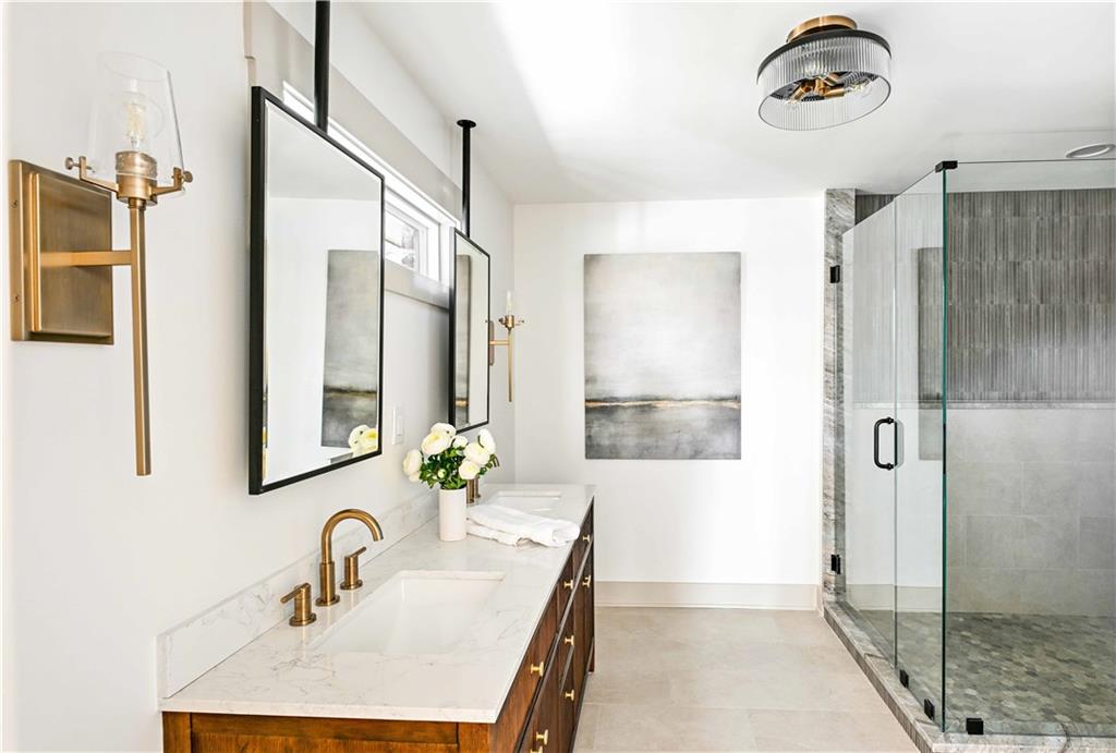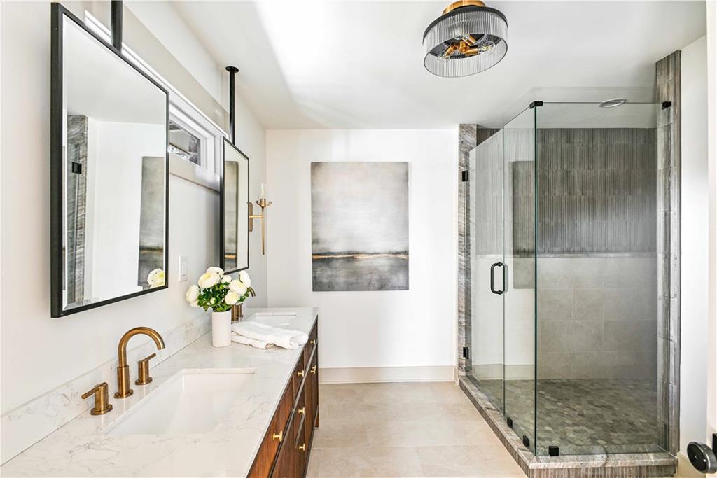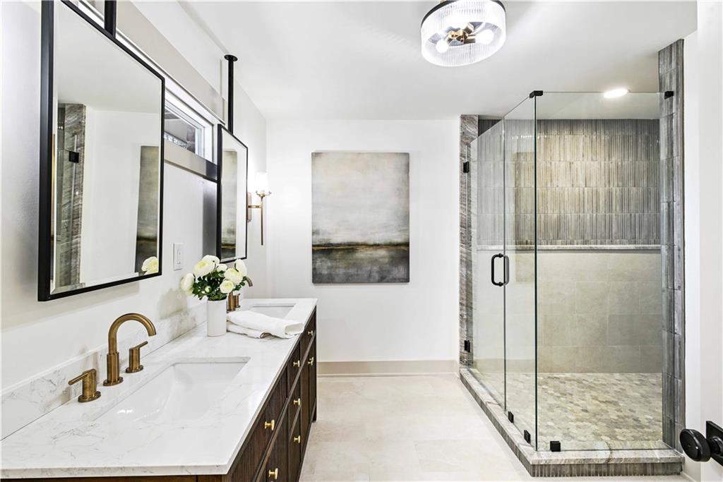 The main level hosts a serene primary suite that feels like a private retreat. The spa-inspired bath showcases a frameless glass shower, dual stone-topped vanity, and refined finishes, while the walk-in closet offers both space and functionality. A stylish half bath and large laundry room add everyday ease to the main level.