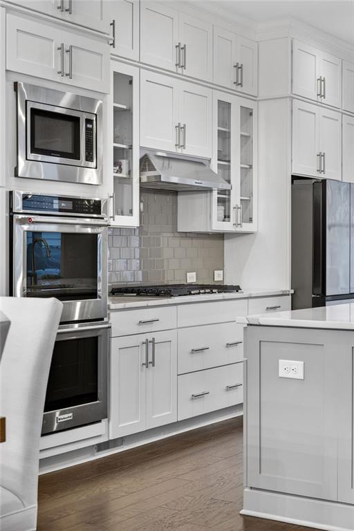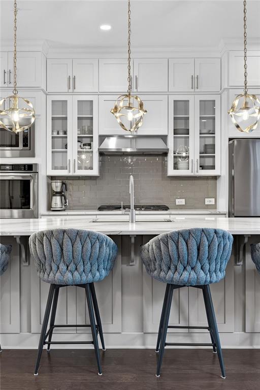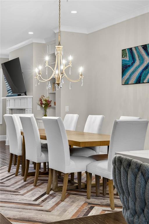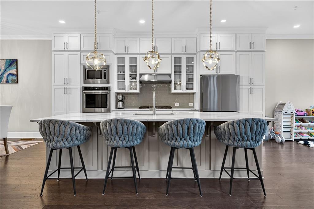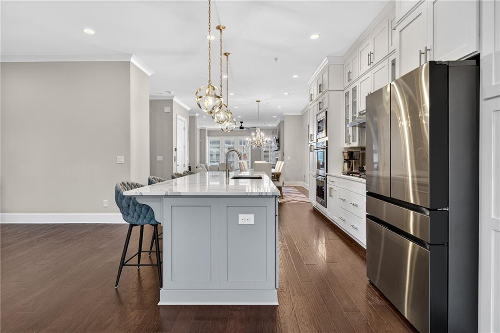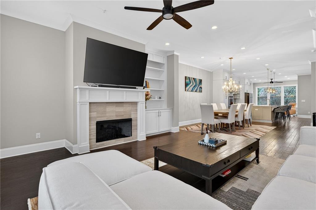 The main level unfolds with an airy, open-concept design enhanced by soaring ceilings, rich custom hardwoods, and abundant natural light. A striking fireplace anchors the living room, creating a warm yet elegant focal point. The adjoining dining area is perfectly suited for hosting intimate dinners or lively gatherings and flows seamlessly into the chef-inspired kitchen. Outfitted with premium stainless steel appliances, custom cabinetry, and an expansive center island ideal for entertaining, the kitchen is both functional and visually impressive.