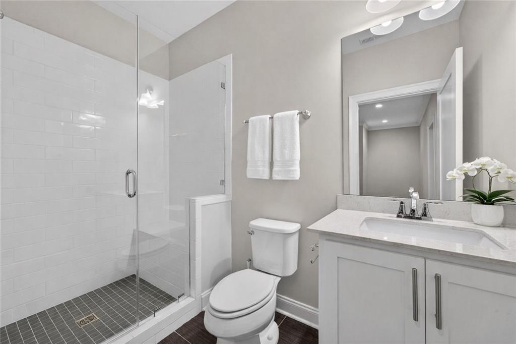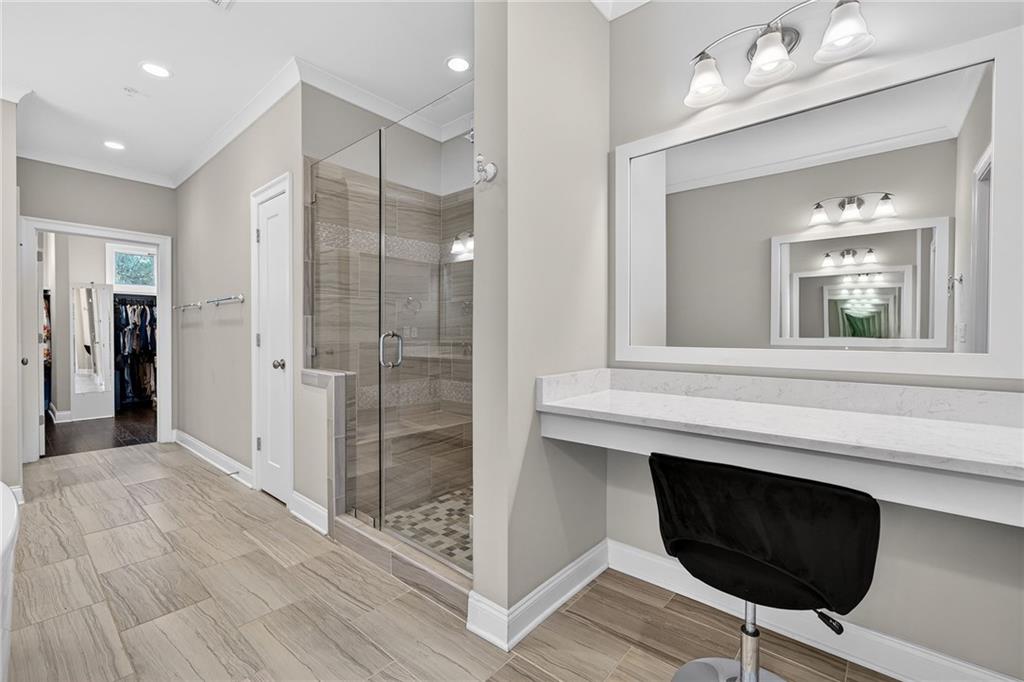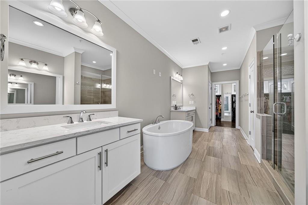 Upstairs, the primary suite serves as a serene retreat, featuring a spa-caliber bath with a deep soaking tub, oversized walk-in shower, and dual vanities designed for comfort and style. Spacious secondary bedrooms each offer ample closet space and private baths, ensuring comfort and privacy for family or guests.