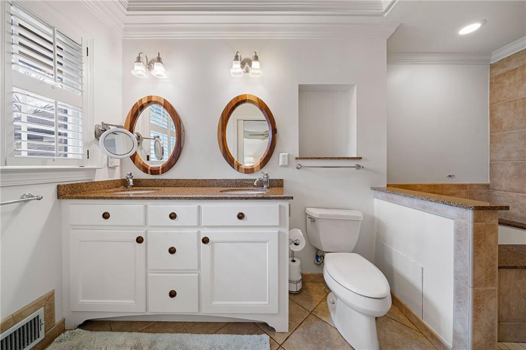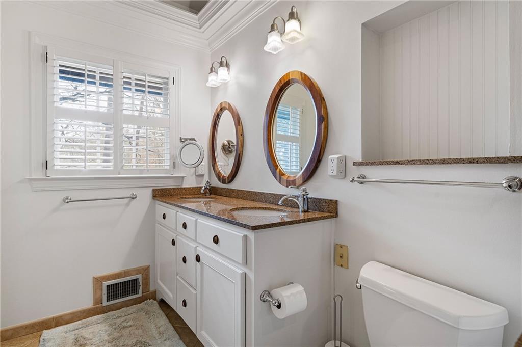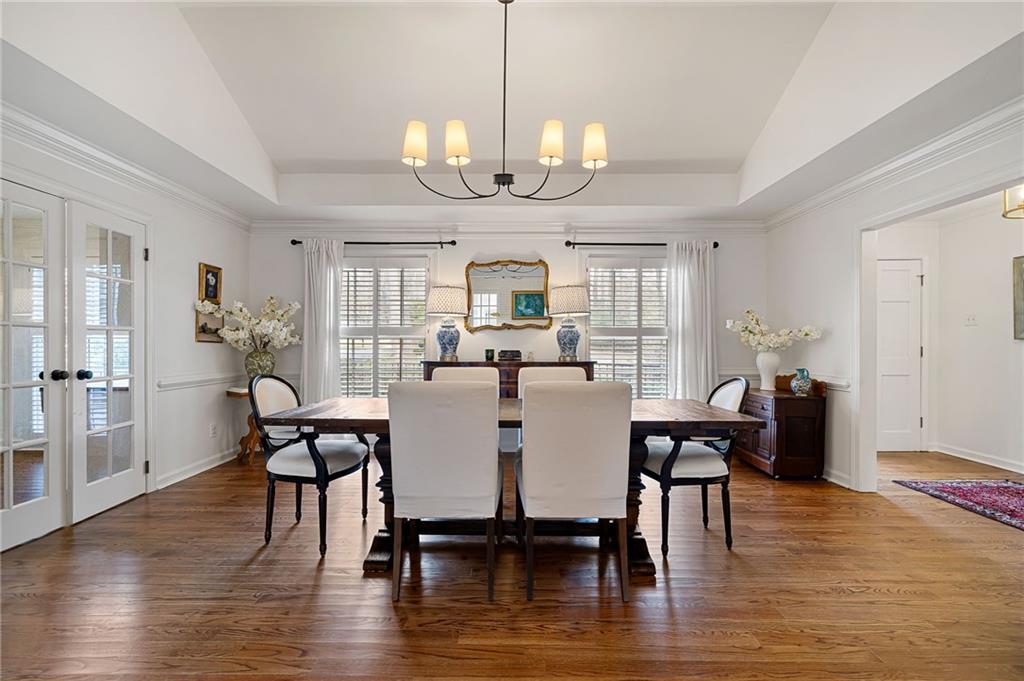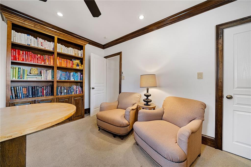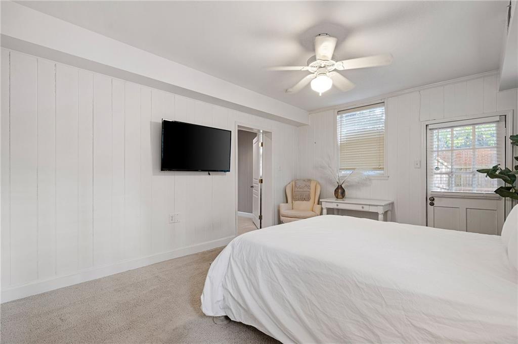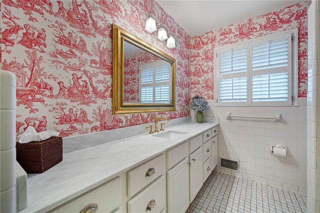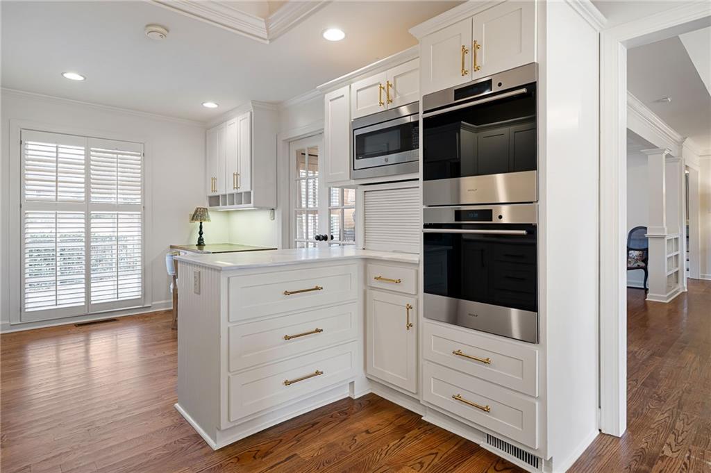 The kitchen, updated in 2024, anchors the home with marble countertops, Wolf appliances, double ovens, and custom cabinetry. A vaulted, screened porch with a gas fireplace extends the living space outdoors, opening to a patio and fire pit overlooking a level lawn framed by mature trees. Set on 0.60 acres, a true rarity inside the Perimeter, the property offers a main-level walk-out and exceptional privacy.