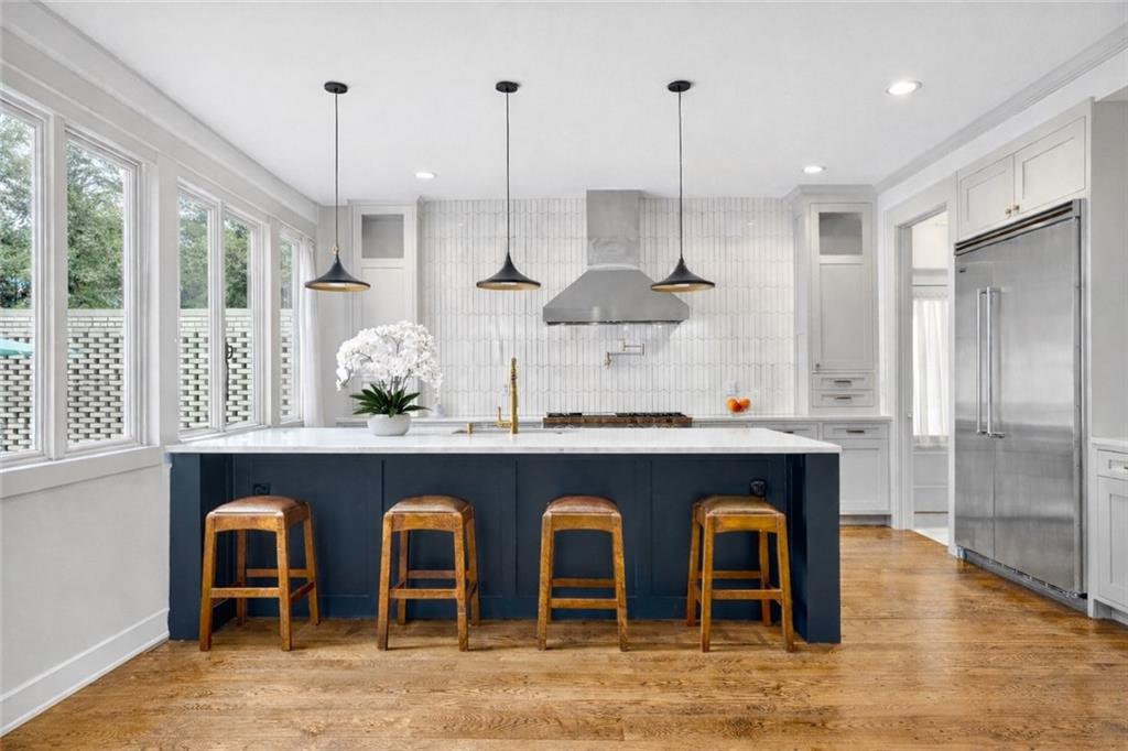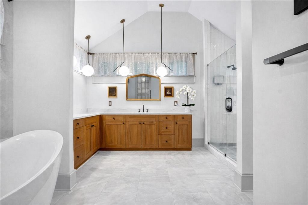 This exceptional Buckhead residence blends architectural sophistication with a comprehensive, custom renovation, creating a timeless yet modern retreat in one of Atlanta's most coveted locations. The home's impressive curb appeal begins with copper accents, elegant ironwork, and curated landscaping that frame the property in year-round beauty. Step inside the welcoming foyer and experience a breathtaking sightline through the open-concept main level to the rear terrace and resort-style heated pool. The kitchen is a chef's dream, appointed with quartz countertops, cabinetry that soars to the ceiling, and professional-grade appliances. Thoughtful lighting design, including custom chandeliers and artful sconces, casts a warm glow over each gathering space. The main-level primary suite is a private sanctuary, featuring a spa-inspired bathroom, a towel warmer, and a luxurious walk-in shower with heated floors. The suite's dressing room offers custom lighting and an abundance of storage. Upstairs, a sunlit landing leads to five bedrooms and four well-appointed baths, each with refined finishes and distinctive design touches. Entertaining is effortless thanks to a wine cellar with display lighting, a bar area, and storage for an extensive collection. Beyond the home, the property unfolds into multiple outdoor living areas: a terrace with a wood-fired pizza oven, manicured gardens, architectural walls and stairs, a tranquil bronze sculpture, and specialty lighting that transforms the grounds into a magical evening escape. A heated pool with custom water features serves as the centerpiece of this outdoor haven. Practical upgrades - including smart home systems, upgraded security, and enhanced outdoor infrastructure -ensure beauty is matched by function. With its blend of craftsmanship, technology, and thoughtful design, this home offers a truly unmatched lifestyle in the heart of Buckhead.