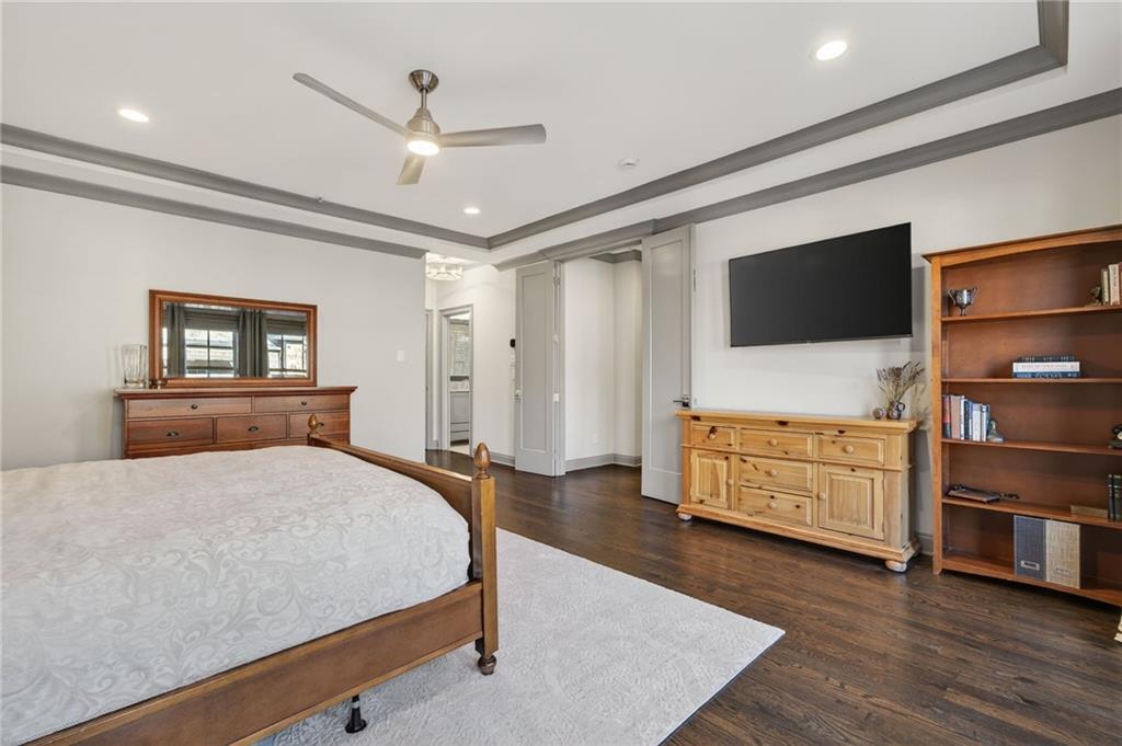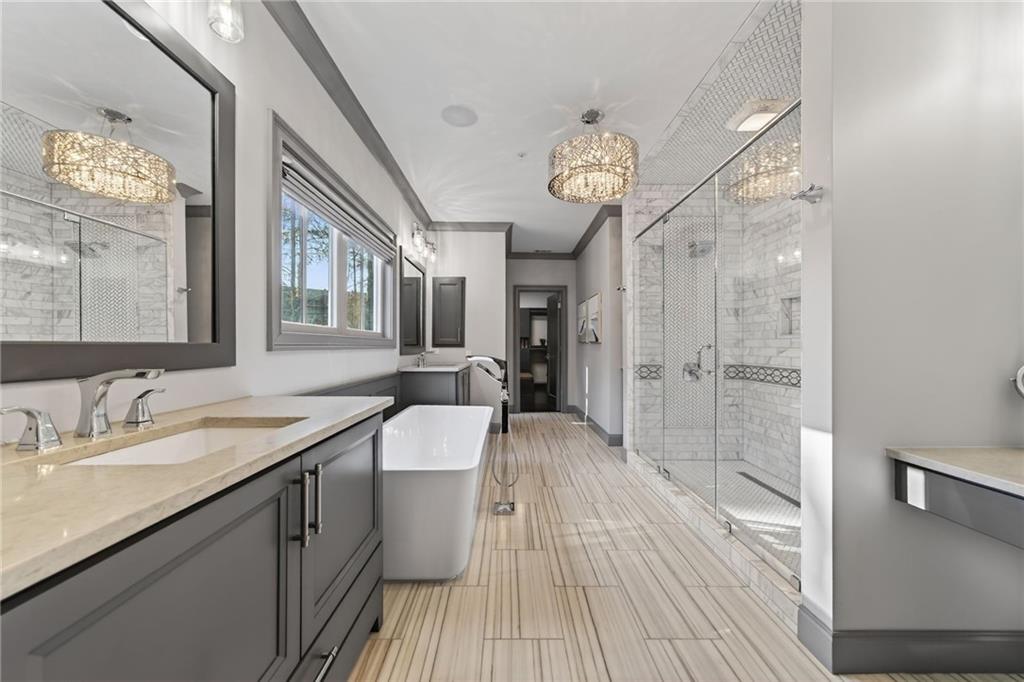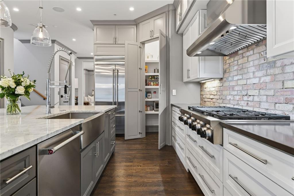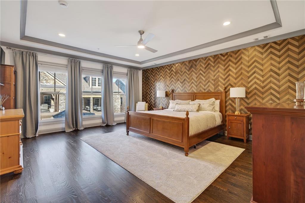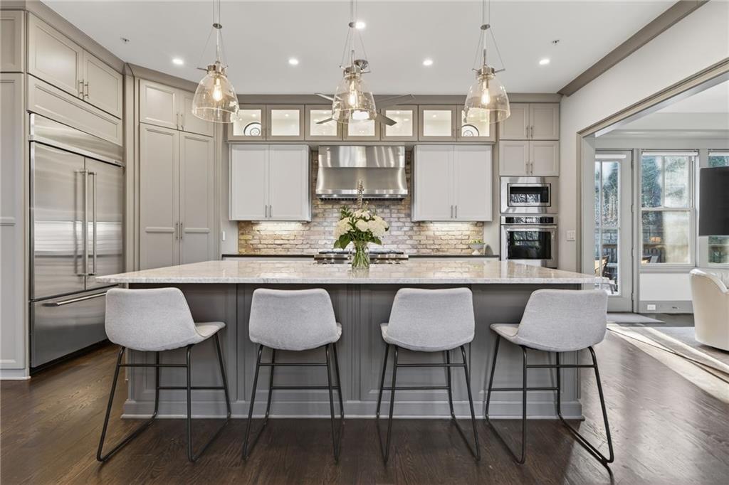 The main level showcases rich hardwood floors and wide, open stairways that enhance the home's bright, flowing layout. A spacious living room with a fireplace opens to a separate formal dining room. The chef's kitchen is a true showpiece, equipped with a gas cooktop, double ovens, a built-in microwave, a wine refrigerator, and an oversized island with seating for four to five. A generous keeping room and casual dining area offer seamless access to the backyard, perfect for indoor-outdoor gatherings. A stylish powder room, dedicated pantry, wine bar, and abundant storage complete this level.
