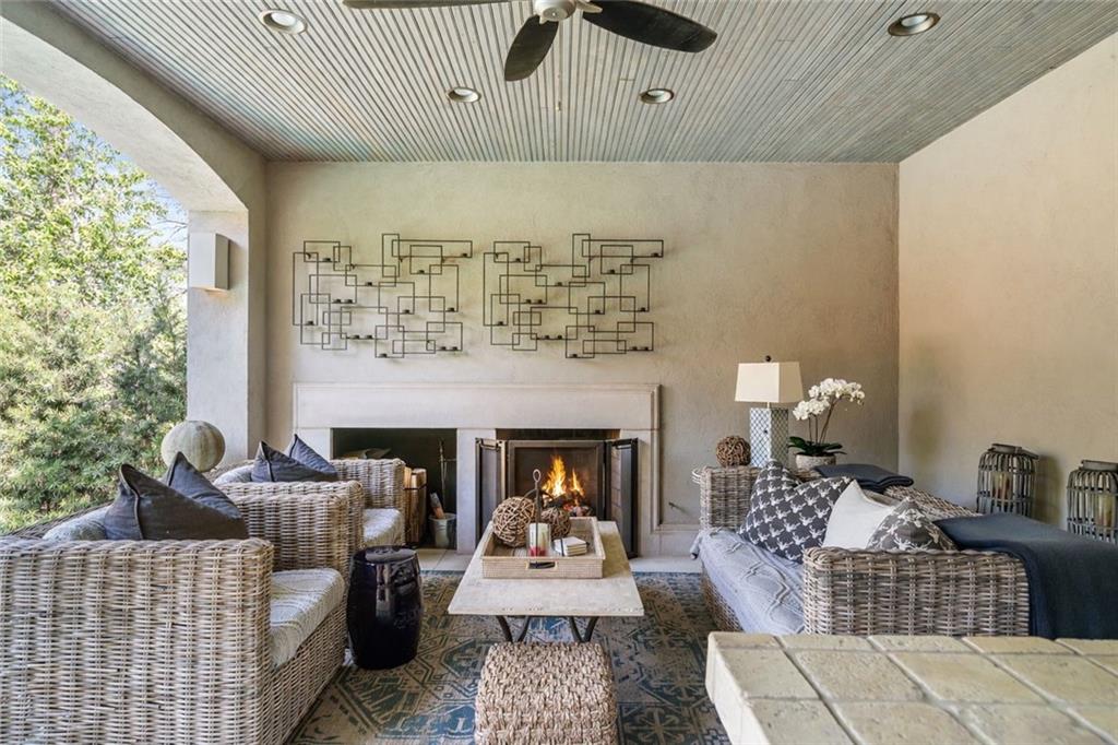 The exterior exudes timeless appeal with soft neutral tones, elegant brick accents, and manicured landscaping, creating a warm and welcoming first impression. Surrounded by mature trees and thoughtfully designed for privacy, the outdoor living spaces include multiple seating areas, a built-in grilling station, and an expansive covered patio with a beautifully finished ceiling.