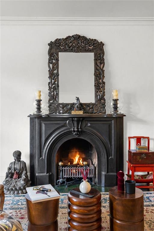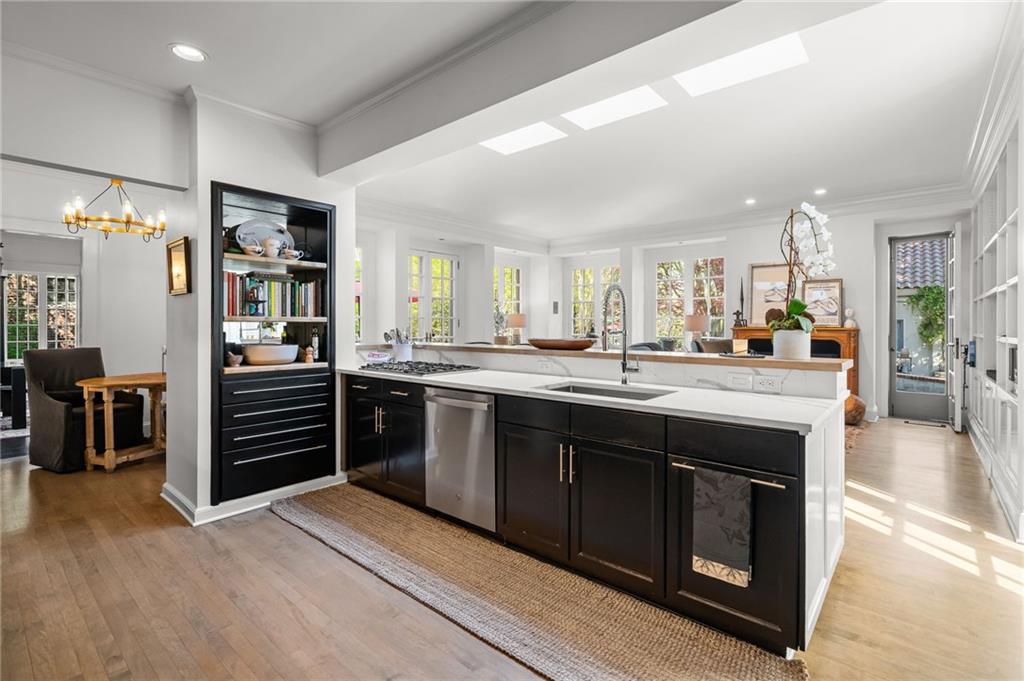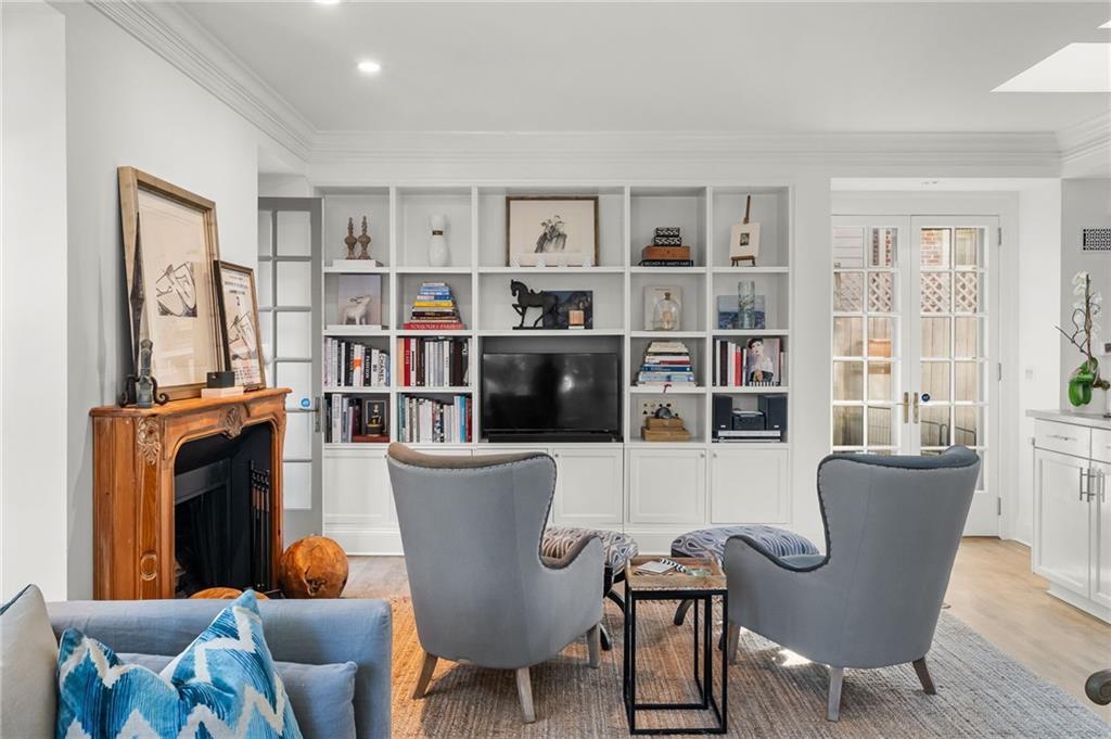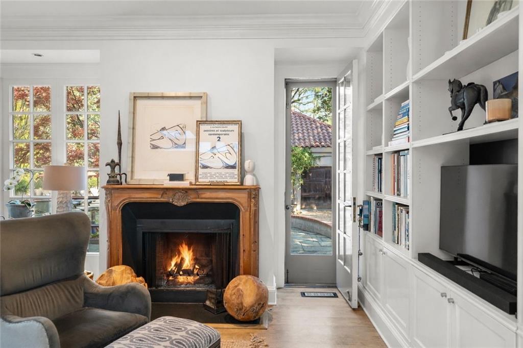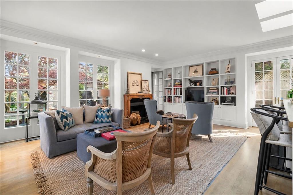 Inside, multiple living spaces, inviting fireplaces, and a well-conceived floor plan provide flexibility for both daily living and hosting guests. Original architectural character is beautifully paired with modern comforts, including central heating and cooling throughout. The kitchen is exceptionally appointed with dual sinks, a dedicated prep space, quartz countertops, and premium commercial-grade appliances by Sub-Zero, Thermador, and Bosch.