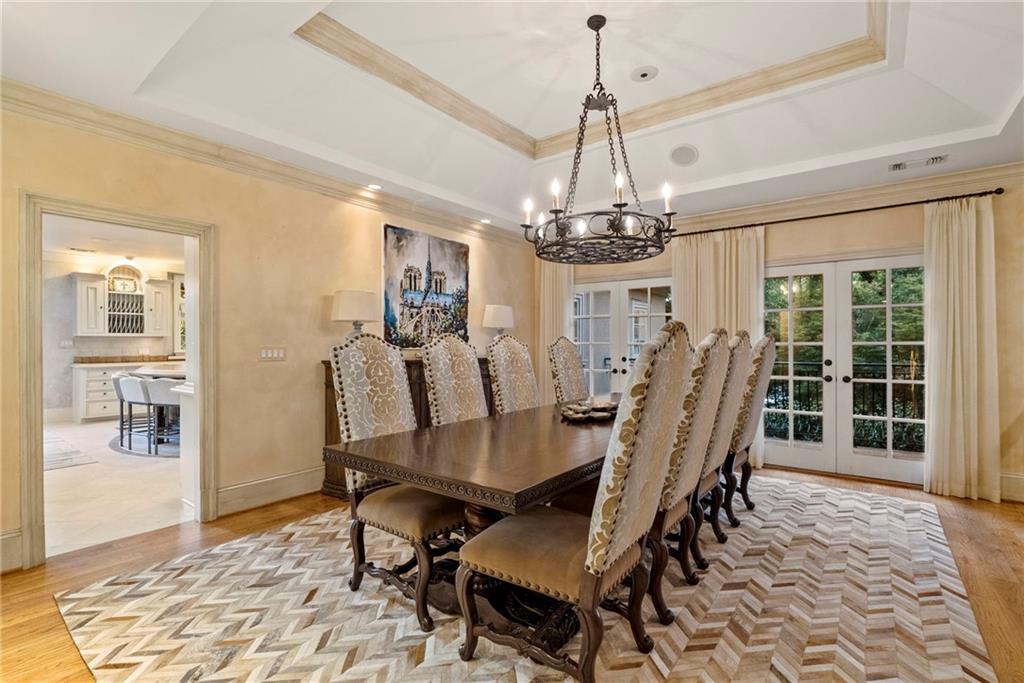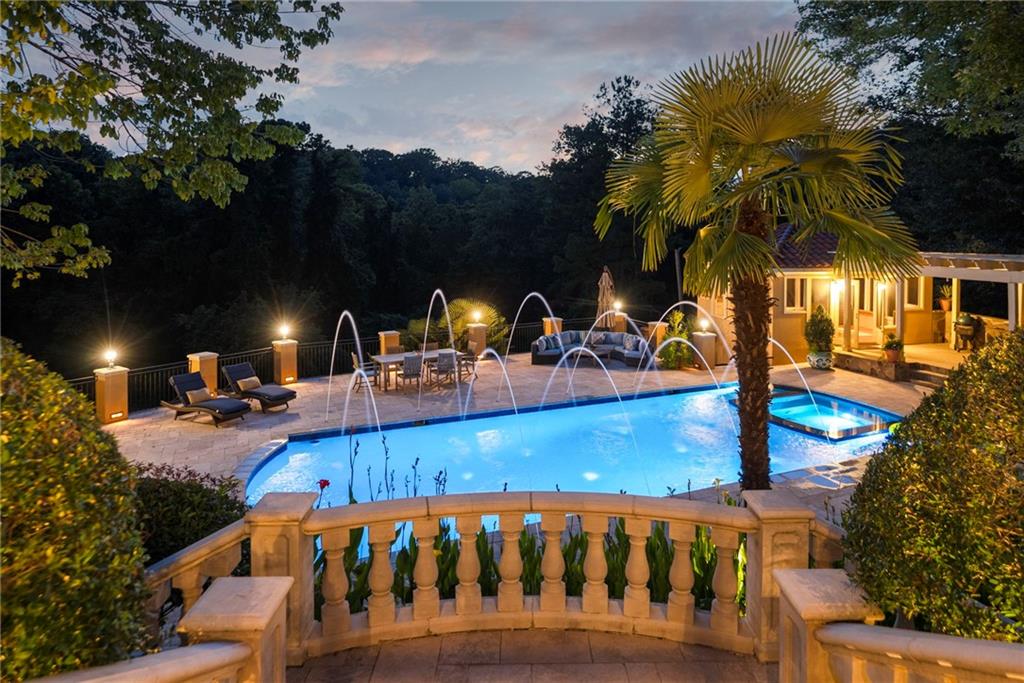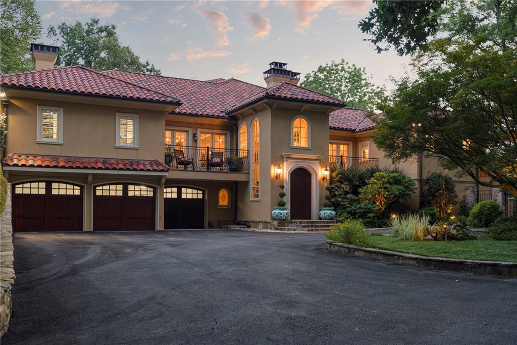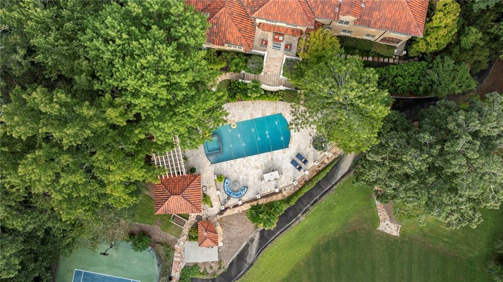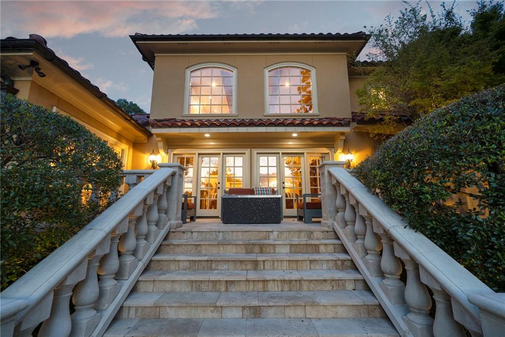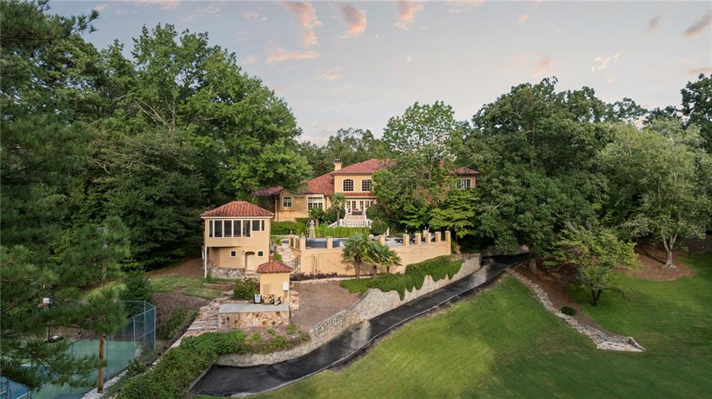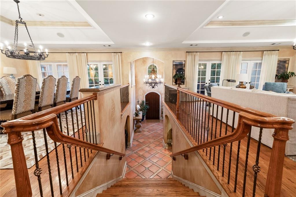 Set on more than 3.8+- acres of private, tree-lined grounds, this remarkable 8,300+- square-foot Spanish-style estate offers a lifestyle of resort-caliber luxury, thoughtfully designed for recreation, entertaining, and everyday ease. From the entry foyer, a gracious staircase introduces the home's refined interiors, where natural light streams across rich hardwood floors. To one side, the formal dining room sets the stage for elegant gatherings; to the other, an inviting living room offers a more intimate setting with dual French doors opening to the outdoor terrace.