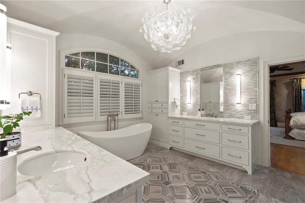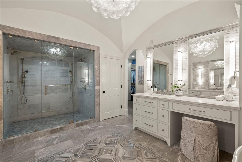 The main-level primary suite is a true retreat, featuring a wood-detailed ceiling, a fireplace, and French doors opening to the outdoors. The spa-inspired bathroom is finished with a groin-vault ceiling, dual vanities, a double-slipper soaking tub, and an expansive shower with multiple showerheads and dual temperature controls. A custom walk-in closet with center island completes the suite with boutique-style storage.