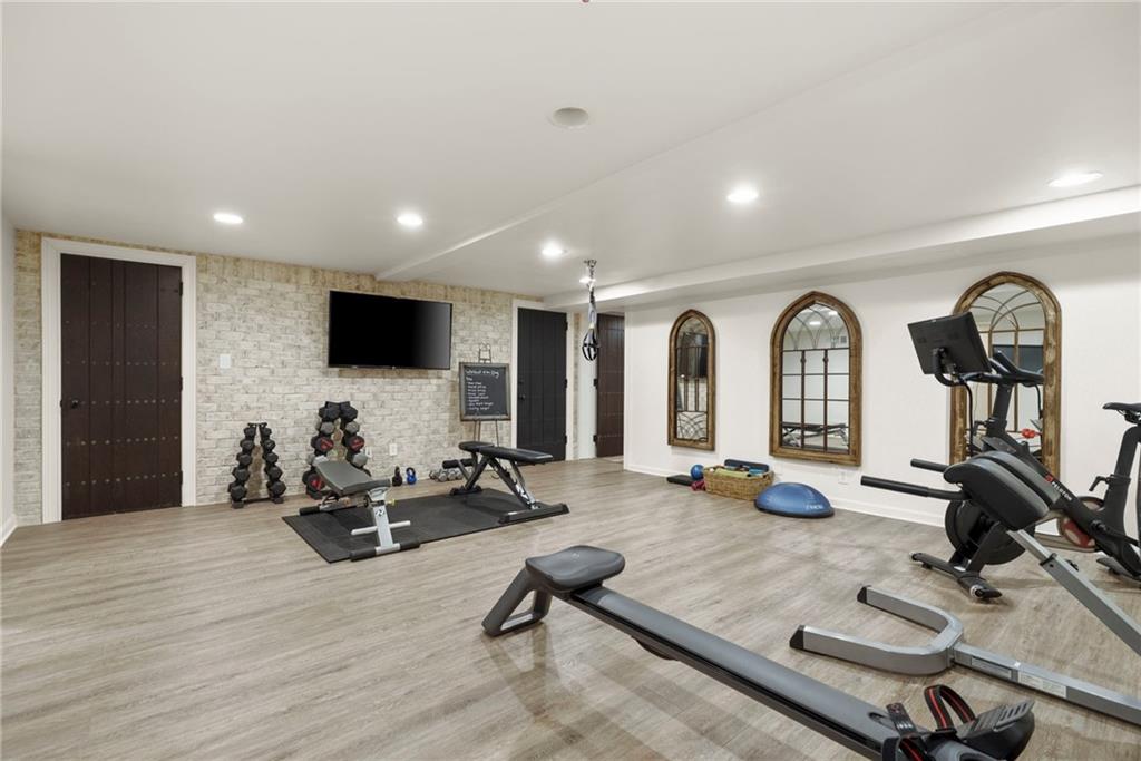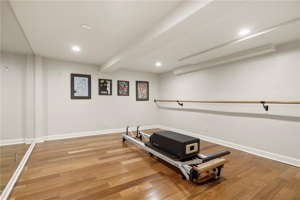 The terrace level expands the home's wellness and lifestyle offerings with a fitness room, Pilates studio, and direct access to the three-car garage with room for four cars and additional storage. The expansive driveway provides parking for up to 12 vehicles, perfect for entertaining on any scale.
