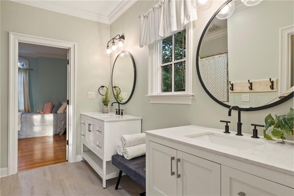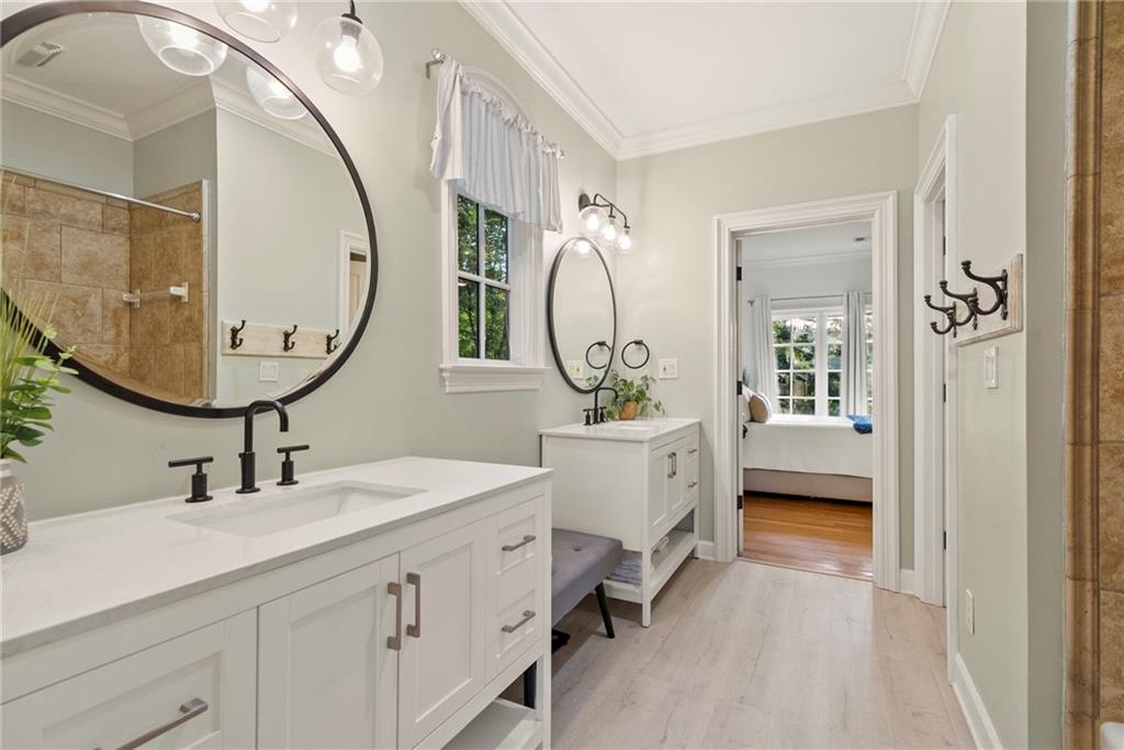 Upstairs, a second office provides a work-from-home space, along with four spacious bedrooms with hardwood floors and walk-in closets. Two bedrooms feature en suite bathrooms, while the remaining two share a Jack-and-Jill bath.