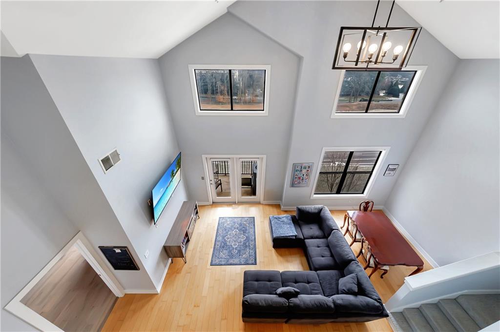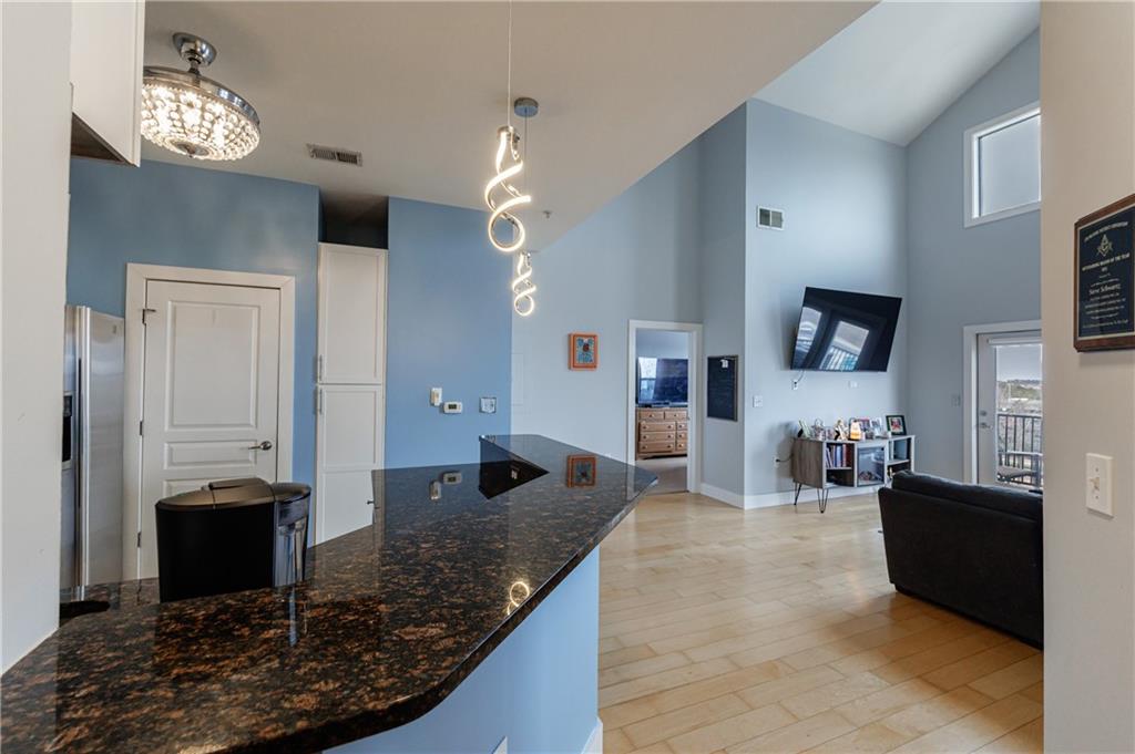 The light-filled living space features dramatic two-story floor-to-ceiling windows that bring in natural light and showcase the city views, while hardwood floors and updated lighting add warmth and style. The kitchen is equipped with granite countertops, stainless steel appliances, and ample cabinetry, seamlessly connecting to the main living and dining areas, perfect for everyday living or entertaining.