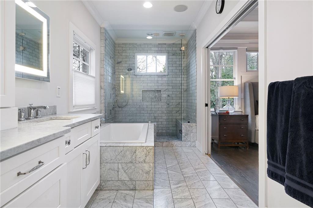 Upstairs, the serene primary suite serves as a private sanctuary with the feel of a luxury getaway. The spa-inspired marble bathroom is a standout, featuring heated floors, a deep soaking tub, and an oversized walk-in shower, perfectly designed for both indulgent relaxation and everyday ease. Two additional bedrooms share a thoughtfully planned Jack-and-Jill bathroom, and a conveniently placed laundry room completes the upper level.